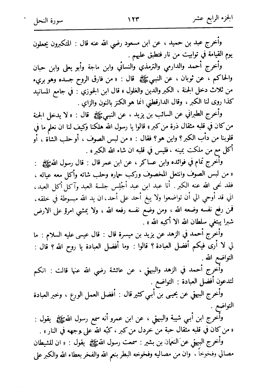وَأخرج الطَّبَرَانِيّ عَن السَّائِب بن يزِيد عَن النَّبِي صلى الله عَلَيْهِ وَسلم قَالَ: لَا يدْخل الْجنَّة من كَانَ فِي قلبه مِثْقَال ذرة من كبر قَالُوا: يَا رَسُول الله هلكنا وَكَيف لنا أَن نعلم مَا فِي قُلُوبنَا من دأب الْكبر وَأَيْنَ هُوَ فَقَالَ: من لبس الصُّوف أَو حلب الشَّاة أَو أكل مَعَ من ملكت يَمِينه فَلَيْسَ فِي قلبه إِن شَاءَ الله الْكبر