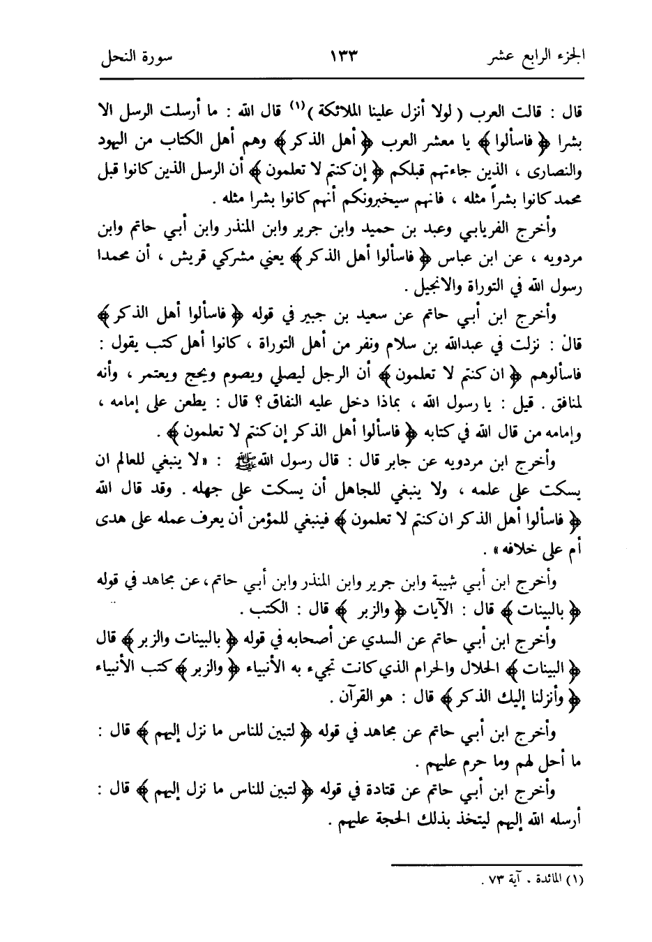 وَأخر الْفرْيَابِيّ وَعبد بن حميد وَابْن جرير وَابْن الْمُنْذر وَابْن أبي حَاتِم وَابْن مرْدَوَيْه عَن ابْن عَبَّاس {فاسألوا أهل الذّكر} يَعْنِي مُشْركي قُرَيْش أَن مُحَمَّدًا رَسُول الله فِي التَّوْرَاة والإِنجيل