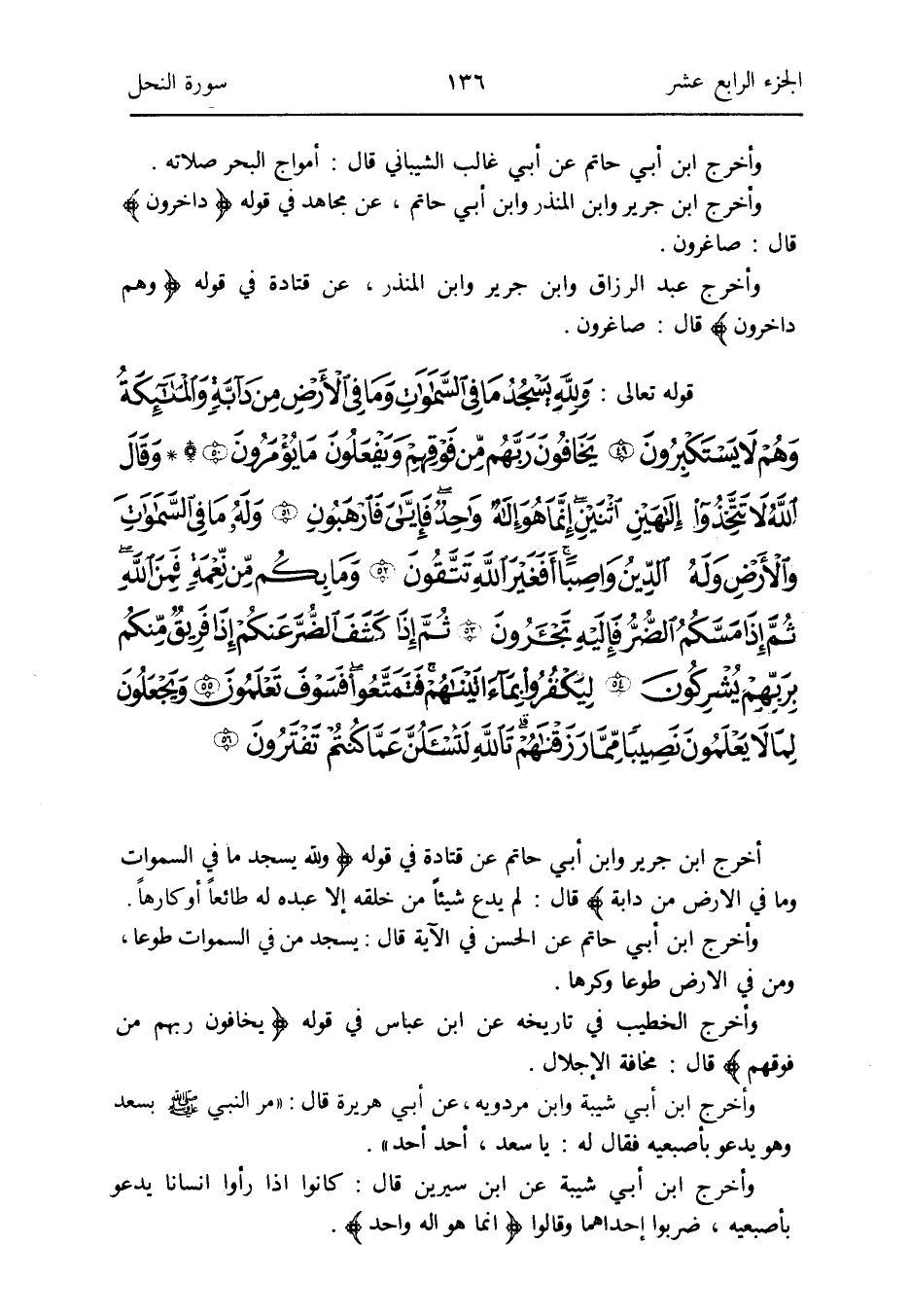 أخرج ابْن جرير وَابْن أبي حَاتِم عَن قَتَادَة فِي قَوْله: {وَللَّه يسْجد مَا فِي السَّمَاوَات وَمَا فِي الأَرْض من دَابَّة} قَالَ: لم يدع شَيْئا من خلقه إِلَّا عَبده لَهُ طَائِعا أَو كَارِهًا