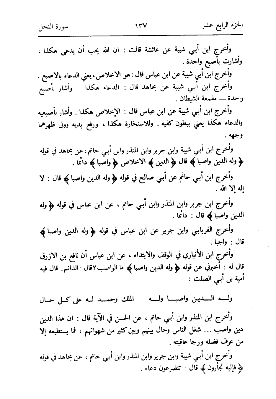 وَأخرج ابْن أبي شيبَة وَابْن جرير وَابْن الْمُنْذر وَابْن أبي حَاتِم عَن مُجَاهِد فِي قَوْله: {وَله الدّين واصباً} قَالَ: {الدّين} الْإِخْلَاص {واصباً} دَائِما