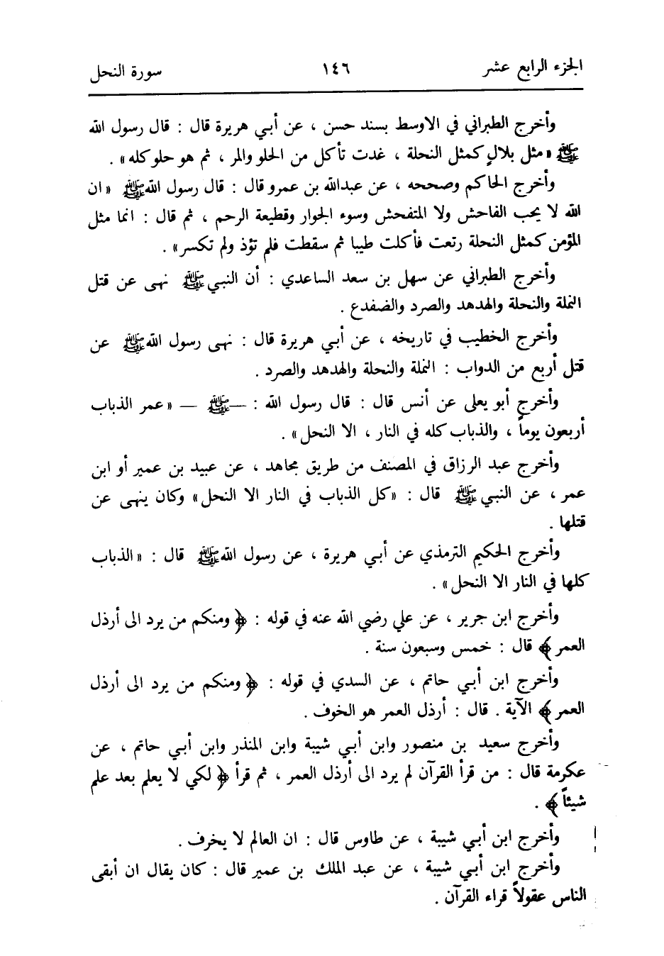 وَأخرج الطَّبَرَانِيّ عَن سهل بن سعد السَّاعِدِيّ: أَن النَّبِي صلى الله عَلَيْهِ وَسلم: نهى عَن قتل النملة والنحلة والهدهد والصرد والضفدع