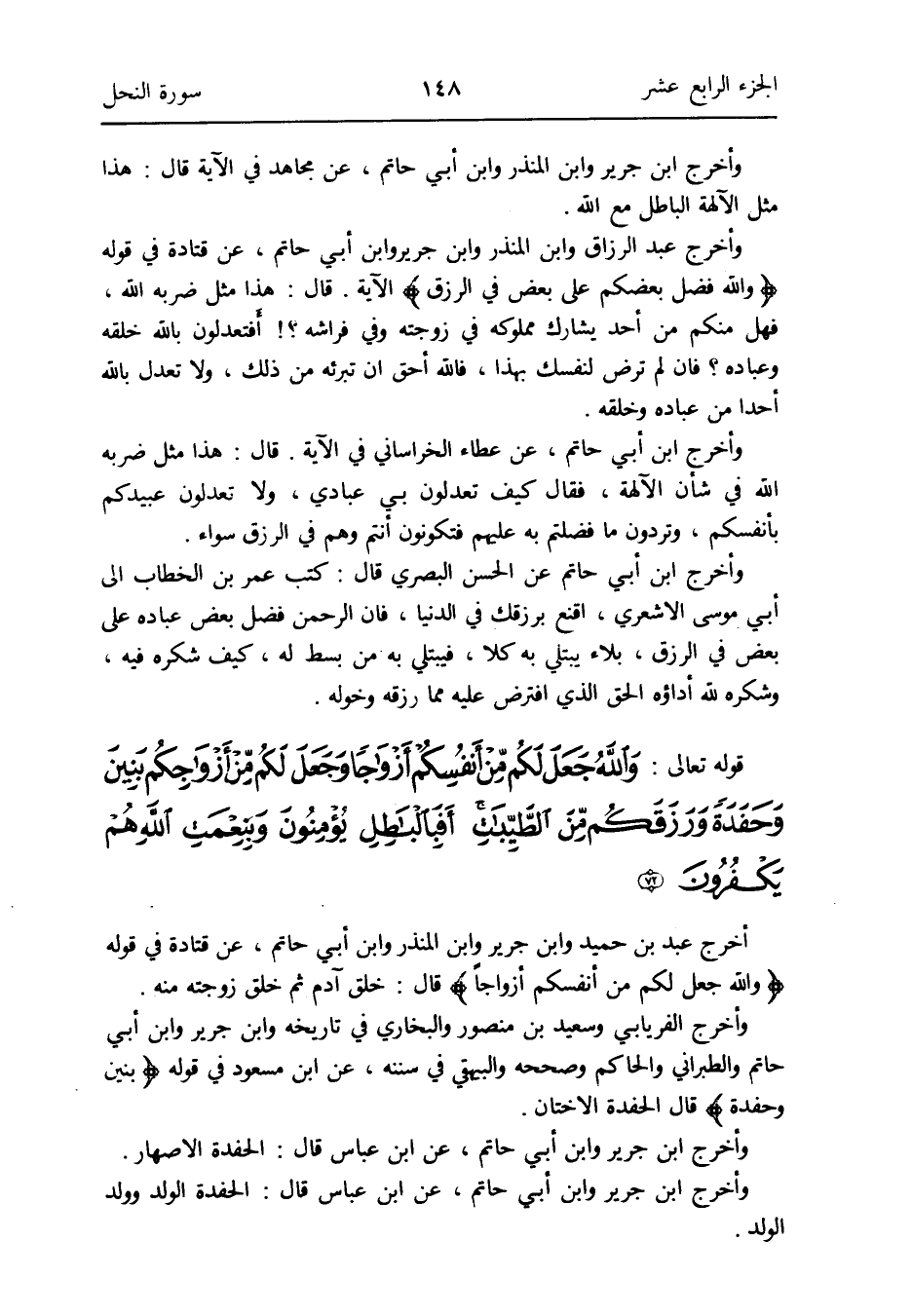 وَأخرج الْفرْيَابِيّ وَسَعِيد بن مَنْصُور وَالْبُخَارِيّ فِي تَارِيخه وَابْن جرير وَابْن أبي حَاتِم وَالطَّبَرَانِيّ وَالْحَاكِم وَصَححهُ وَالْبَيْهَقِيّ فِي سنَنه عَن ابْن مَسْعُود فِي قَوْله: {بَنِينَ وحفدة} قَالَ الحفدة الْأخْتَان