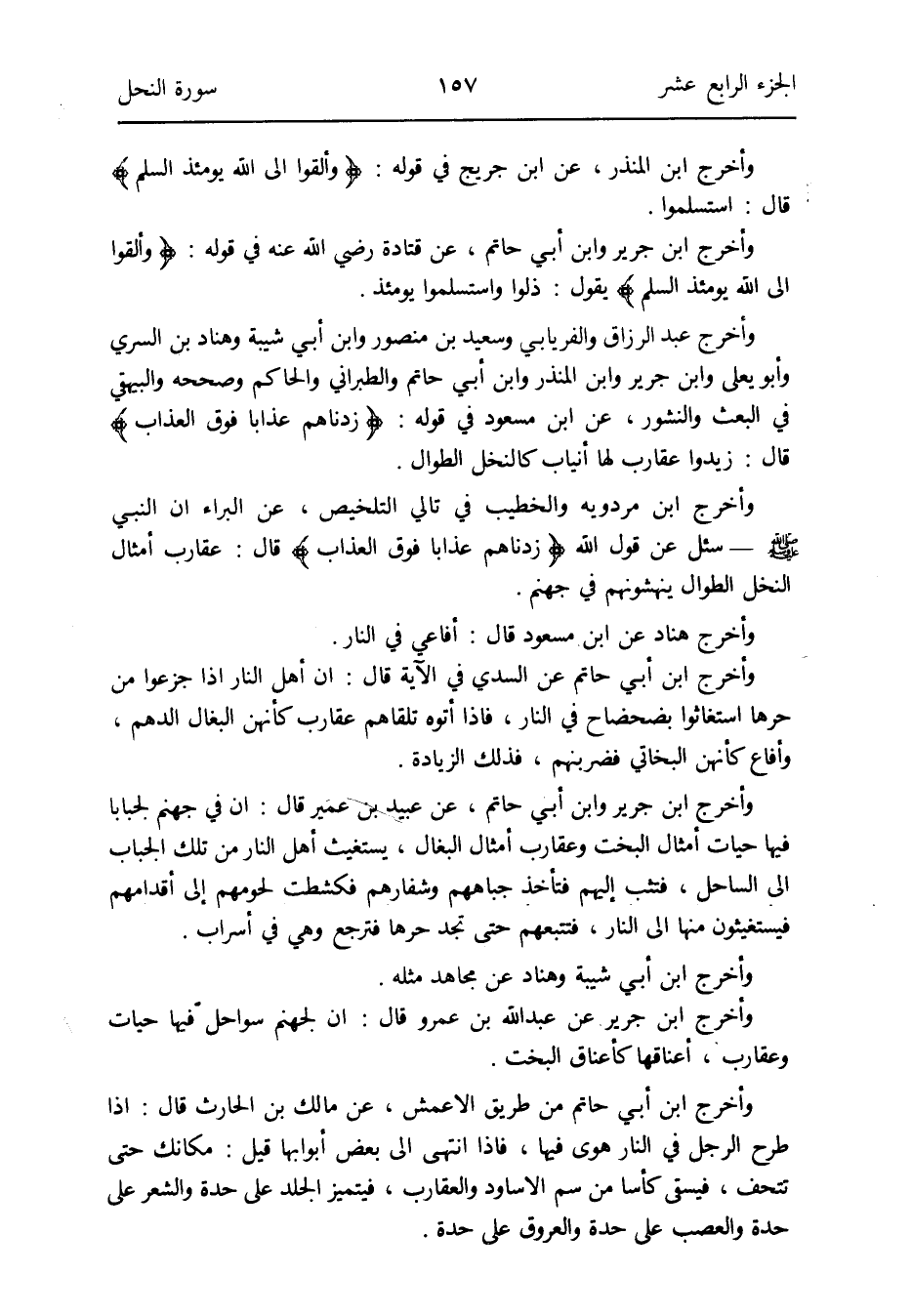 وَأخرج ابْن جرير عَن عبد الله بن عَمْرو قَالَ: إِن لِجَهَنَّم سواحل فِيهَا حيات وعقارب أعناقها كأعناق البخت