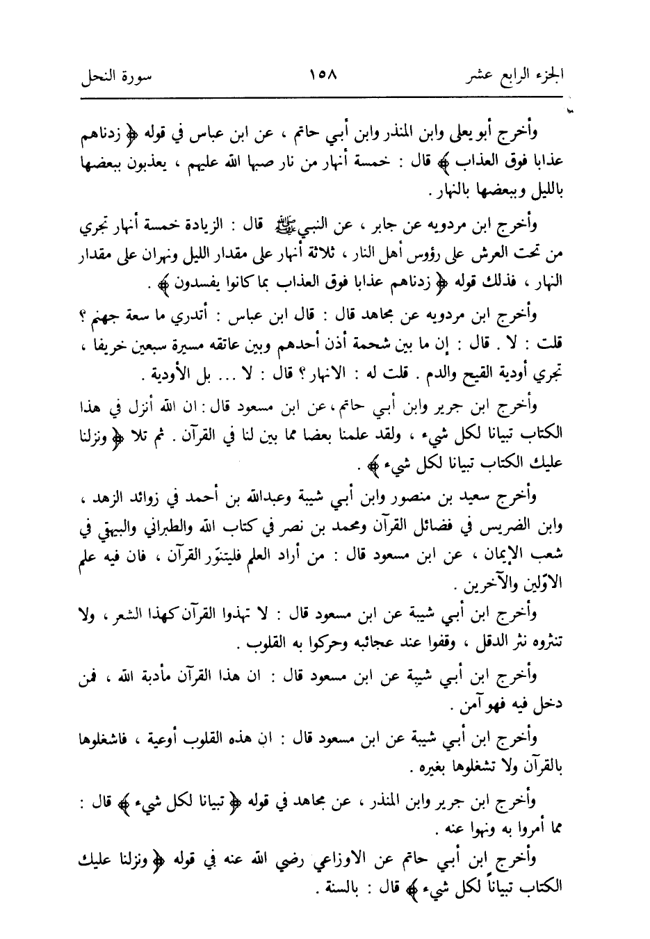 وَأخرج ابْن جرير وَابْن أبي حَاتِم عَن ابْن مَسْعُود قَالَ: إِن الله أنزل فِي هَذَا الْكتاب تبياناً لكل شَيْء وَلَقَد عَملنَا بَعْضًا مِمَّا بَين لنا فِي الْقُرْآن