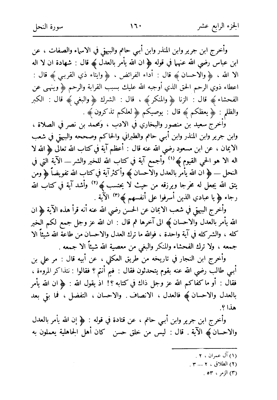 وَأخرج ابْن جرير وَابْن الْمُنْذر وَابْن أبي حَاتِم وَالْبَيْهَقِيّ فِي الْأَسْمَاء وَالصِّفَات عَن ابْن عَبَّاس رَضِي الله عَنْهُمَا فِي قَوْله: {إِن الله يَأْمر بِالْعَدْلِ} قَالَ: شَهَادَة أَن لَا إِلَه إِلَّا الله {وَالْإِحْسَان} قَالَ: أَدَاء الْفَرَائِض {وإيتاء ذِي الْقُرْبَى} قَالَ: إِعْطَاء ذَوي الرَّحِم الْحق الَّذِي أوجبه الله عَلَيْك بِسَبَب الْقَرَابَة وَالرحم {وَينْهى عَن الْفَحْشَاء} قَالَ: الزِّنَا {وَالْمُنكر} قَالَ: الشّرك {وَالْبَغي} قَالَ: الْكبر وَالظُّلم: {يعظكم} يُوصِيكُم {لَعَلَّكُمْ تذكرُونَ}
