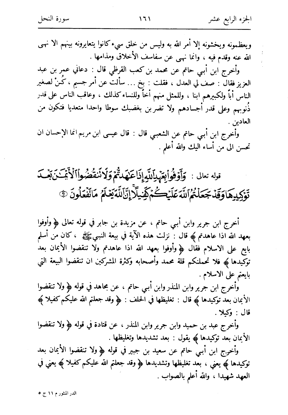 وَأخرج ابْن جرير وَابْن الْمُنْذر وَابْن أبي حَاتِم عَن مُجَاهِد فِي قَوْله: {وَلَا تنقضوا الْأَيْمَان بعد توكيدها} قَالَ: تغليظها فِي الْحلف: {وَقد جعلتم الله عَلَيْكُم كَفِيلا} قَالَ: وَكيلا