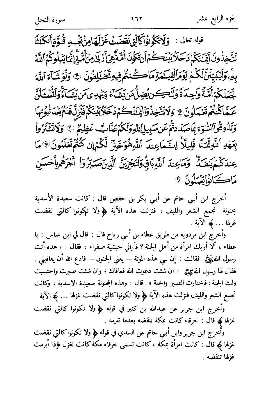 وَأخرج ابْن جرير عَن عبد الله بن كثير فِي قَوْله: {وَلَا تَكُونُوا كَالَّتِي نقضت غزلها} قَالَ: خرقاء كَانَت بِمَكَّة تنقضه بَعْدَمَا تبرمه
