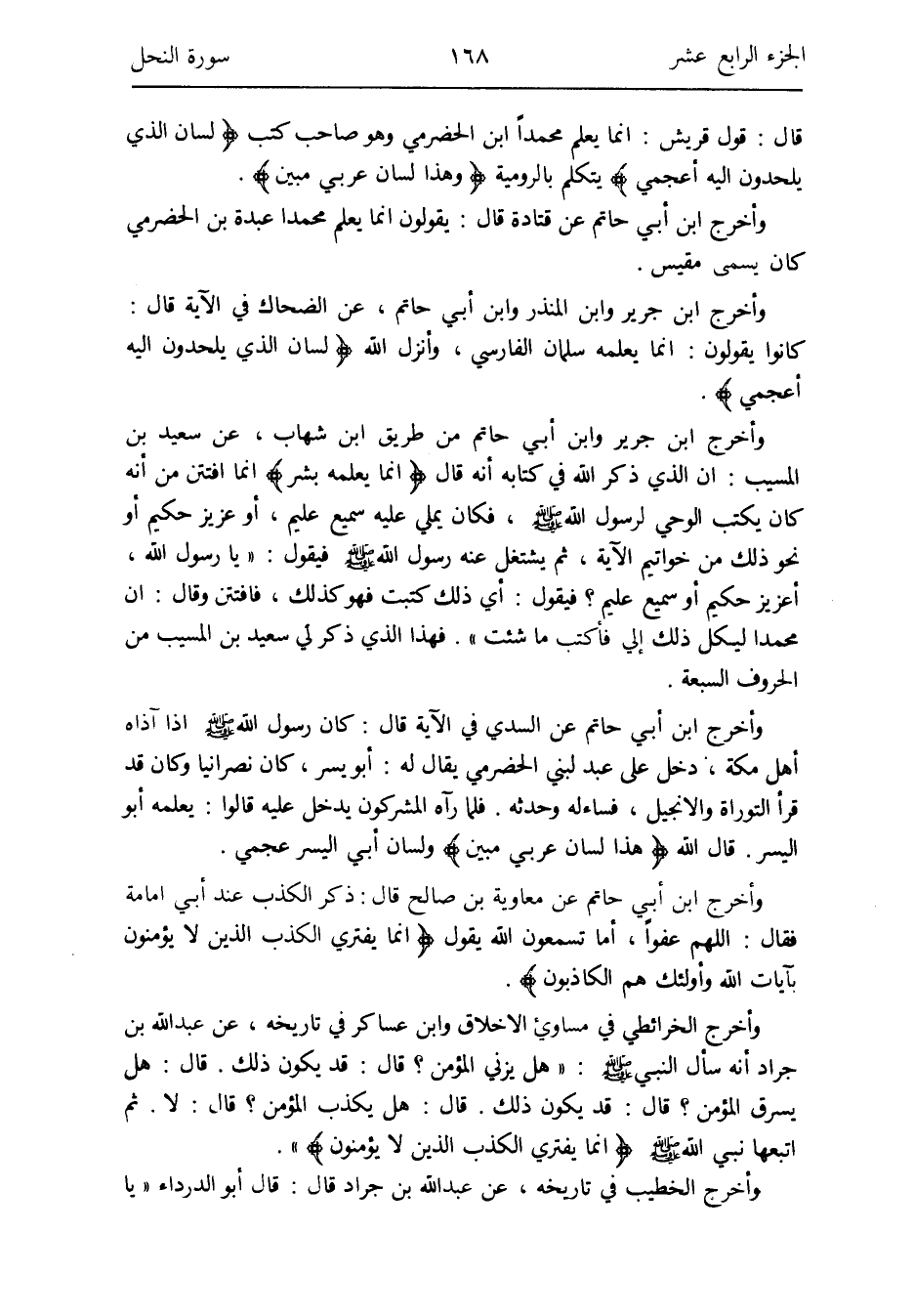 قَالَ: قَول قُرَيْش: إِنَّمَا يعلم مُحَمَّدًا بن الْحَضْرَمِيّ وَهُوَ صَاحب كتب {لِسَان الَّذِي يلحدون إِلَيْهِ أعجمي} يتَكَلَّم بالرومية {وَهَذَا لِسَان عَرَبِيّ مُبين}