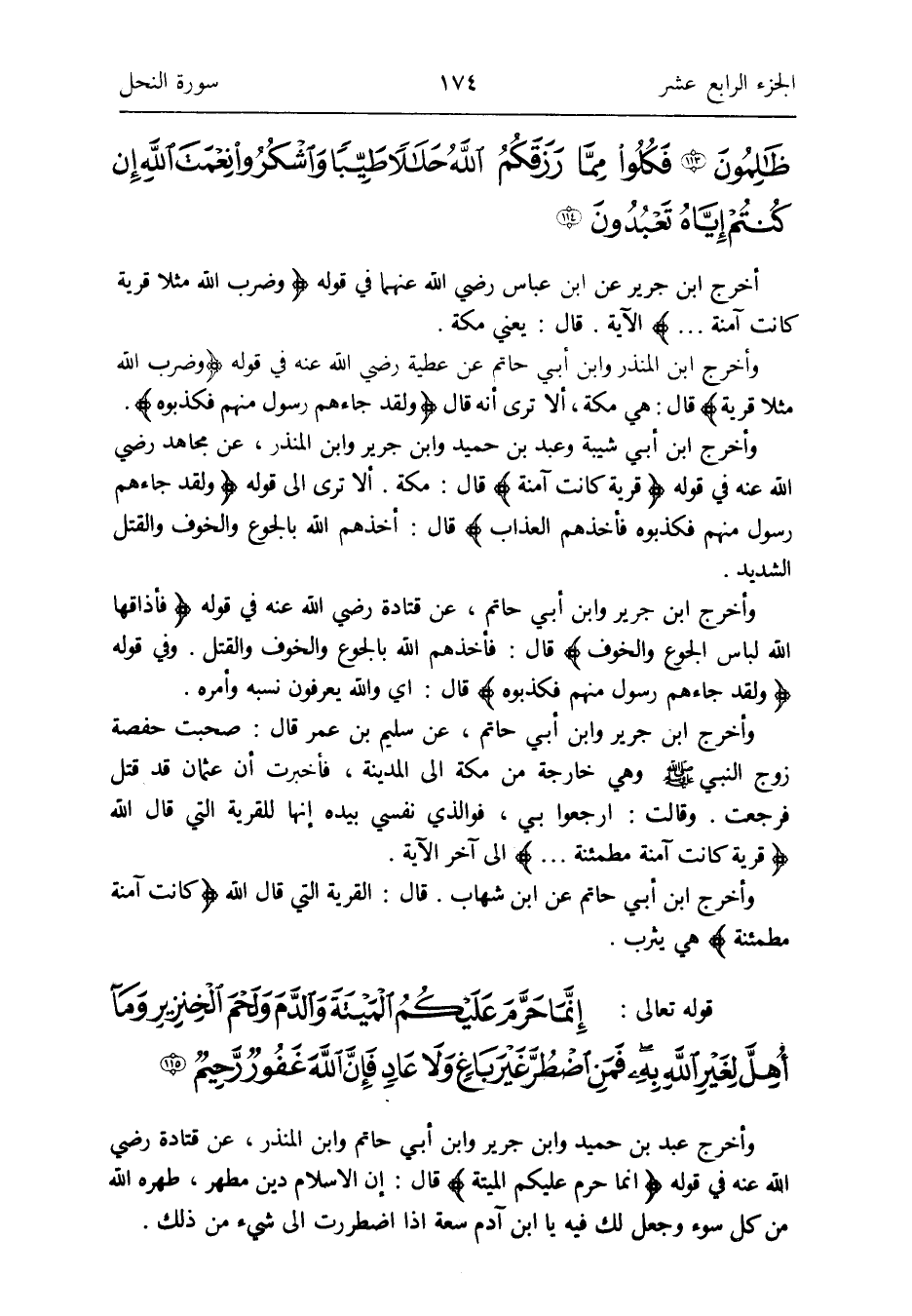 أخرج ابْن جرير عَن ابْن عَبَّاس رَضِي الله عَنْهُمَا فِي قَوْله: {وَضرب الله مثلا قَرْيَة كَانَت آمِنَة} الْآيَة
