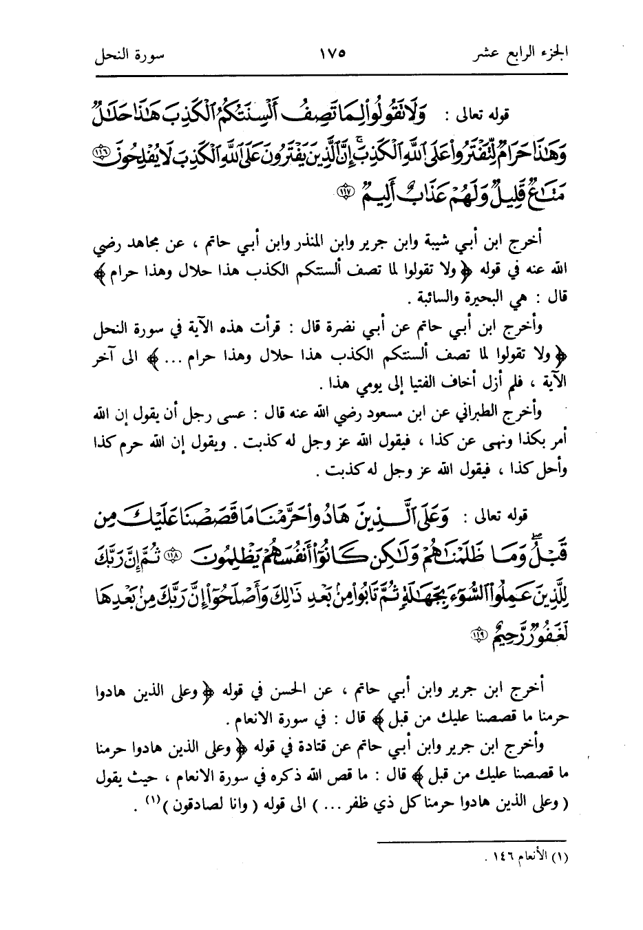 وَأخرج ابْن جرير وَابْن أبي حَاتِم عَن قَتَادَة فِي قَوْله: {وعَلى الَّذين هادوا حرمنا مَا قَصَصنَا عَلَيْك من قبل} قَالَ: مَا قصّ الله ذكره فِي سُورَة الْأَنْعَام حَيْثُ يَقُول: (وعَلى الَّذين هادوا حرمنا كل ذِي ظفر