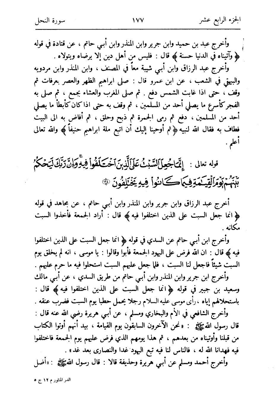 أخرج عبد الرَّزَّاق وَابْن جرير وَابْن الْمُنْذر وَابْن أبي حَاتِم عَن مُجَاهِد فِي قَوْله: {إِنَّمَا جعل السبت على الَّذين اخْتلفُوا فِيهِ} قَالَ: أَرَادَ الْجُمُعَة فَأخذُوا السبت مَكَانَهُ