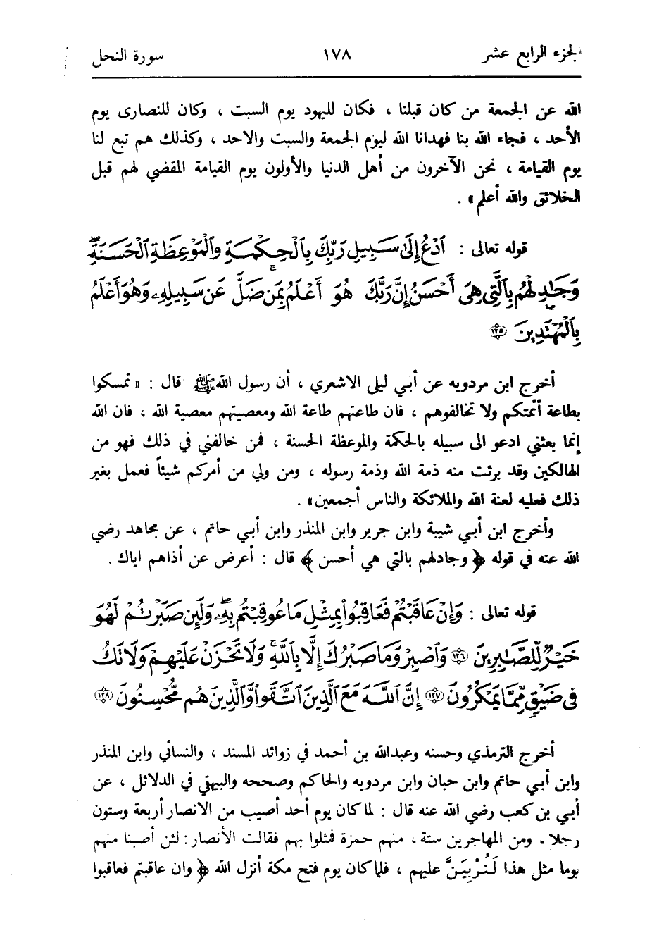 أخرج التِّرْمِذِيّ وَحسنه وَعبد الله بن أَحْمد فِي زَوَائِد الْمسند وَالنَّسَائِيّ وَابْن الْمُنْذر وَابْن أبي حَاتِم وَابْن حبَان وَابْن مرْدَوَيْه وَالْحَاكِم وَصَححهُ وَالْبَيْهَقِيّ فِي الدَّلَائِل عَن أبي بن كَعْب رَضِي الله عَنهُ قَالَ: لما كَانَ يَوْم أحد أُصِيب من الْأَنْصَار أَرْبَعَة وَسِتُّونَ رجلا وَمن الْمُهَاجِرين سِتَّة مِنْهُم حَمْزَة فمثلوا بهم فَقَالَت الْأَنْصَار: لَئِن أصبْنَا مِنْهُم يَوْمًا مثل هَذَا لَنُربِيَنَّ عَلَيْهِم فَلَمَّا كَانَ يَوْم فتح مَكَّة أنزل الله: {وَإِن عَاقَبْتُمْ فَعَاقِبُوا بِمثل مَا عُوقِبْتُمْ بِهِ وَلَئِن صَبَرْتُمْ لَهو خير للصابرين}