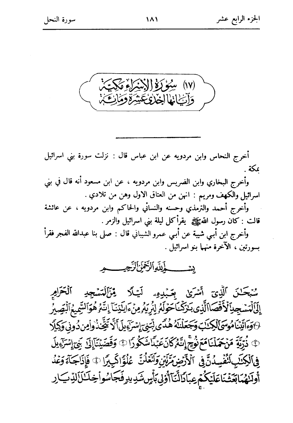 مُقَدّمَة سُورَة الْإِسْرَاء أخرج النّحاس وَابْن مرْدَوَيْه عَن ابْن عَبَّاس قَالَ: نزلت سُورَة بني إِسْرَائِيل بِمَكَّة