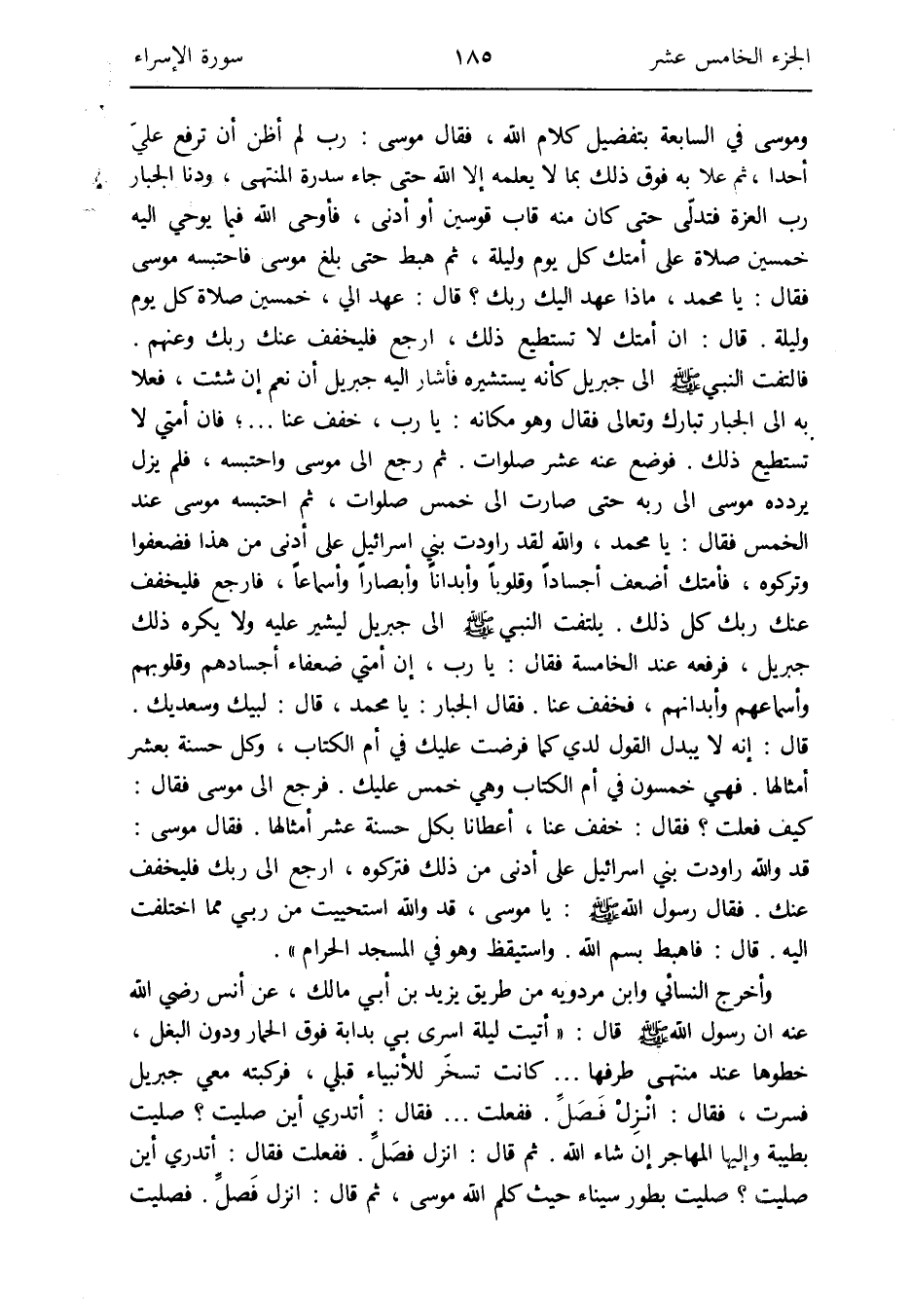 ثمَّ رَجَعَ إِلَى مُوسَى واحتبسه قلم يزل يردده مُوسَى إِلَى ربه حَتَّى صَارَت إِلَى خمس صلوَات ثمَّ احتبسه مُوسَى عِنْد الْخمس فَقَالَ: يَا مُحَمَّد وَالله لقد راودت بني إِسْرَائِيل على أدنى من هَذَا فضعفوا وتركوه فأمتك أَضْعَف أجسادا وَقُلُوبًا وأبدانا وأبصارنا وأسماعاً فَارْجِع فليخفف عَنْك رَبك كل ذَلِك