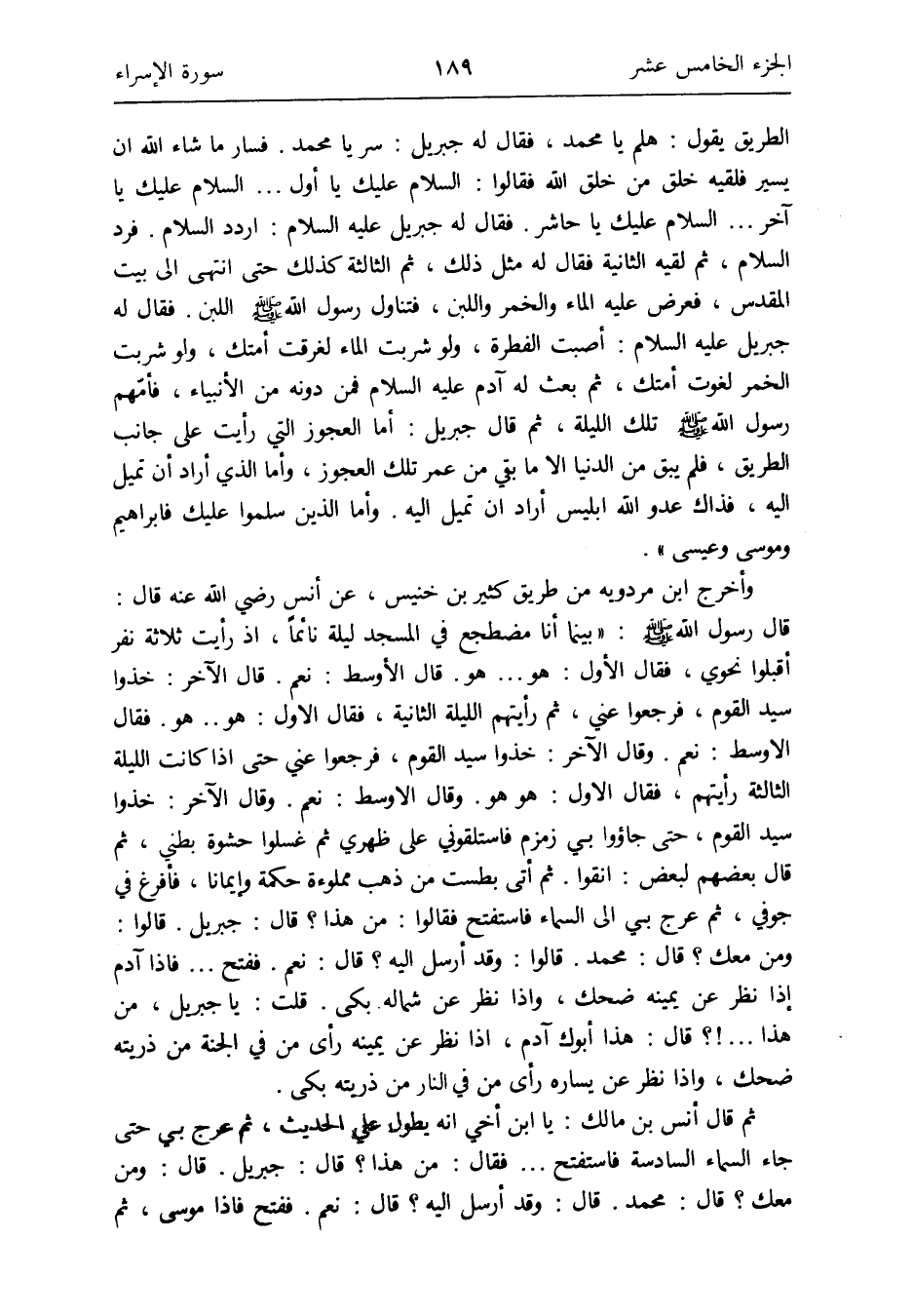 فَرد السَّلَام ثمَّ لقِيه الثَّانِيَة فَقَالَ لَهُ مثل ذَلِك ثمَّ الثَّالِثَة كَذَلِك حَتَّى انْتهى إِلَى بَيت الْمُقَدّس فَعرض عَلَيْهِ المَاء وَالْخمر وَاللَّبن فَتَنَاول رَسُول الله صلى الله عَلَيْهِ وَسلم اللَّبن