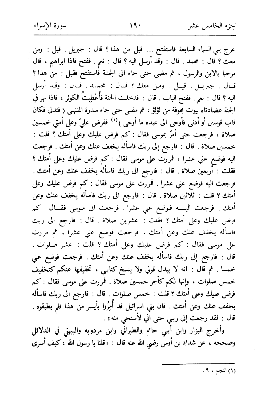 وَأخرج الْبَزَّار وَابْن أبي حَاتِم وَالطَّبَرَانِيّ وَابْن مرْدَوَيْه وَالْبَيْهَقِيّ فِي الدَّلَائِل وَصَححهُ عَن شَدَّاد بن أَوْس رَضِي الله عَنهُ قَالَ: قُلْنَا يَا رَسُول الله كَيفَ أسرِي