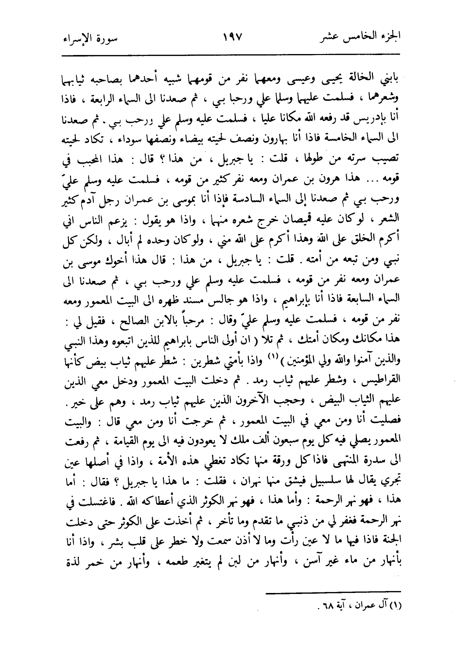 ثمَّ صعدنا إِلَى السَّمَاء السَّابِعَة فَإِذا أَنا بإبراهيم وَإِذا هُوَ جَالس مُسْند ظَهره إِلَى الْبَيْت الْمَعْمُور وَمَعَهُ نفر من قومه فَسلمت عَلَيْهِ وَسلم عَليّ وَقَالَ: مرْحَبًا بالابن الصَّالح فَقيل لي: هَذَا مَكَانك وَمَكَان أمتك ثمَّ تَلا (إِن أولى النَّاس بإبراهيم للَّذين اتَّبعُوهُ وَهَذَا النَّبِي وَالَّذين آمنُوا وَالله ولي الْمُؤمنِينَ) (آل عمرَان آيَة 68) وَإِذا بأمتي شطرين: شطر عَلَيْهِم ثِيَاب بيض كَأَنَّهَا الْقَرَاطِيس وَشطر عَلَيْهِم ثِيَاب رمد
