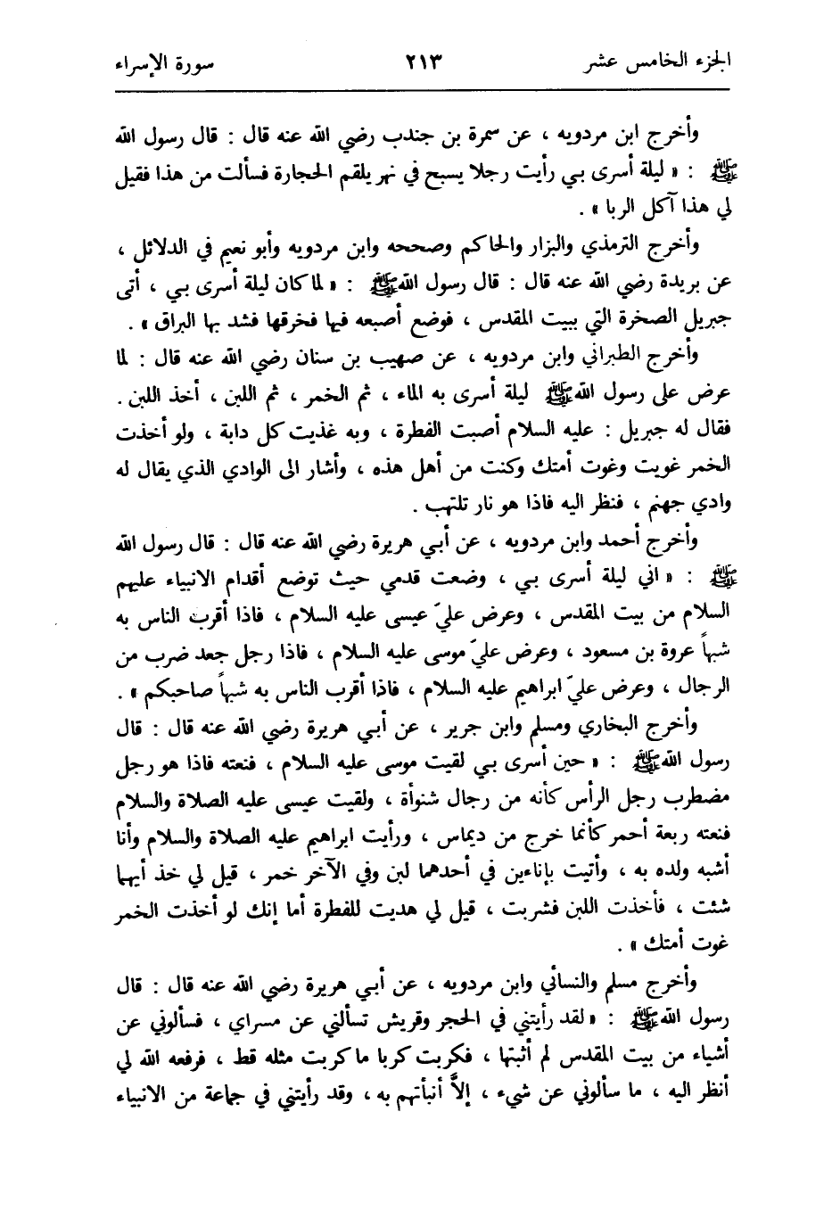 وَأخرج البُخَارِيّ وَمُسلم وَابْن جرير عَن أبي هُرَيْرَة رَضِي الله عَنهُ قَالَ: قَالَ رَسُول الله صلى الله عَلَيْهِ وَسلم: حِين أسرِي بِي لقِيت مُوسَى عَلَيْهِ السَّلَام فنعته فَإِذا هُوَ رجل مُضْطَرب رجل الرَّأْس كَأَنَّهُ من رجال شنوأة وَلَقِيت عِيسَى عَلَيْهِ الصَّلَاة وَالسَّلَام فنعته ربعَة أَحْمَر كَأَنَّمَا خرج من ديماس وَرَأَيْت إِبْرَاهِيم عَلَيْهِ الصَّلَاة وَالسَّلَام أَنا أشبه وَلَده بِهِ وأتيت بإناءين فِي أَحدهمَا لبن وَفِي الآخر خمر قيل لي خُذ أَيهمَا شِئْت فَأخذت اللَّبن فَشَرِبت قيل لي هديت للفطرة أما لَو أَنَّك لَو أخذت الْخمر غوت أمتك