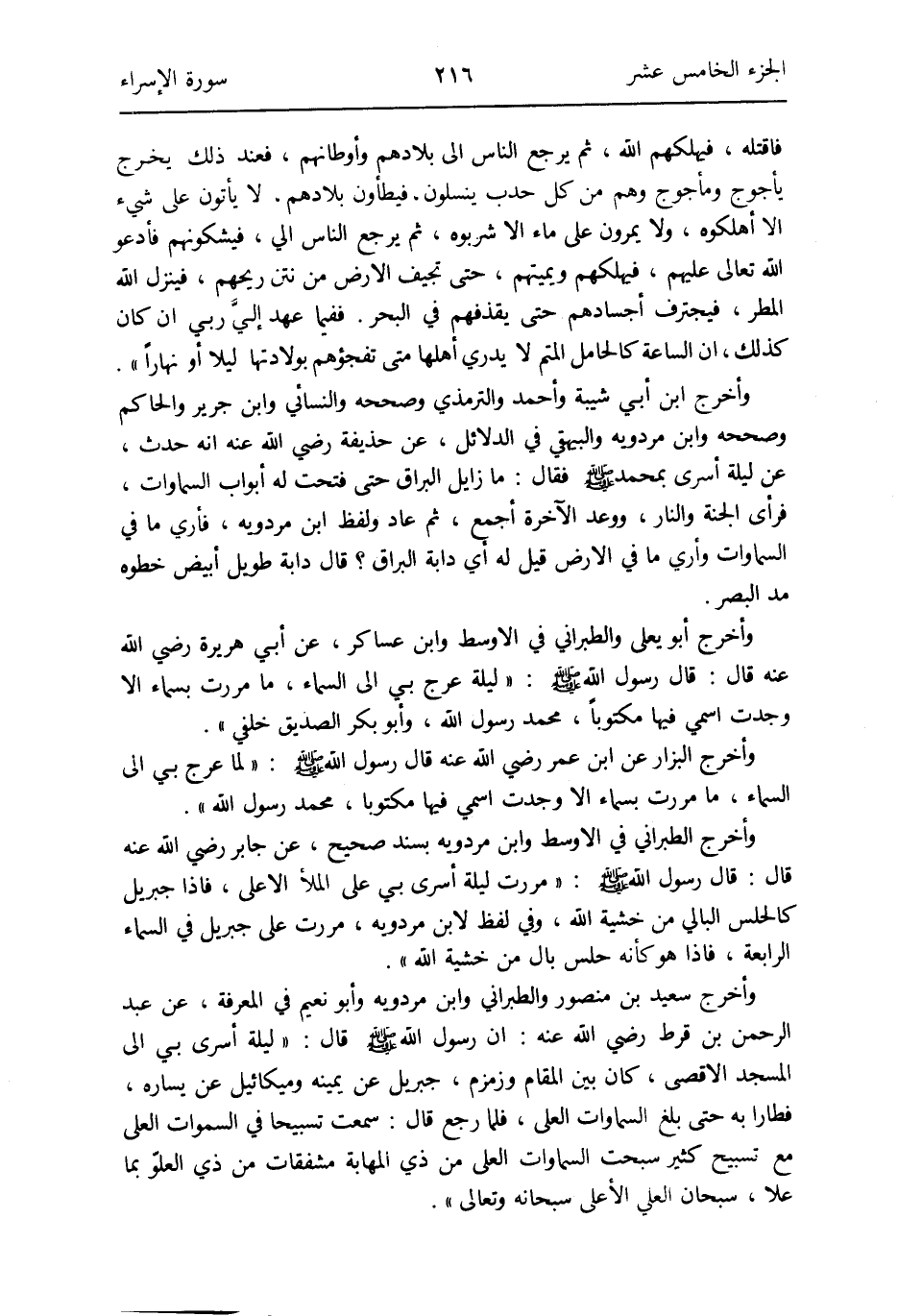 وَأخرج سعيد بن مَنْصُور وَالطَّبَرَانِيّ وَابْن مرْدَوَيْه وَأَبُو نعيم فِي الْمعرفَة عَن عبد الرَّحْمَن بن قرط رَضِي الله عَنهُ: أَن رَسُول الله صلى الله عَلَيْهِ وَسلم قَالَ: لَيْلَة أسرِي بِي إِلَى الْمَسْجِد الْأَقْصَى كَانَ بَين الْمقَام وزمزم جِبْرِيل عَن يَمِينه وَمِيكَائِيل عَن يسَاره فطَارَا بِهِ حَتَّى بلغ السَّمَاوَات العلى فَلَمَّا رَجَعَ قَالَ: سَمِعت تسبيحاً فِي السَّمَوَات العلى مَعَ تَسْبِيح كثير سبحت السَّمَاوَات العلى من ذِي المهابة مشفقات من ذِي العلوّ بِمَا علا سُبْحَانَ الْعلي الْأَعْلَى سُبْحَانَهُ وَتَعَالَى