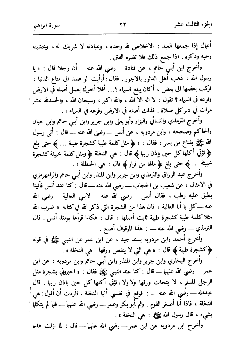 وَأخرج البُخَارِيّ وَابْن جريروابن الْمُنْذر وَابْن أبي حَاتِم وَابْن مرْدَوَيْه عَن ابْن عمر - رَضِي الله عَنْهُمَا - قَالَ: كُنَّا عِنْد النَّبِي صلى الله عَلَيْهِ وَسلم فَقَالَ: اخبروني مثل الرجل الْمُسلم لَا يتحات وَرقهَا وَلَا وَلَا تؤتي أكلهَا كل حِين بِإِذن رَبهَا