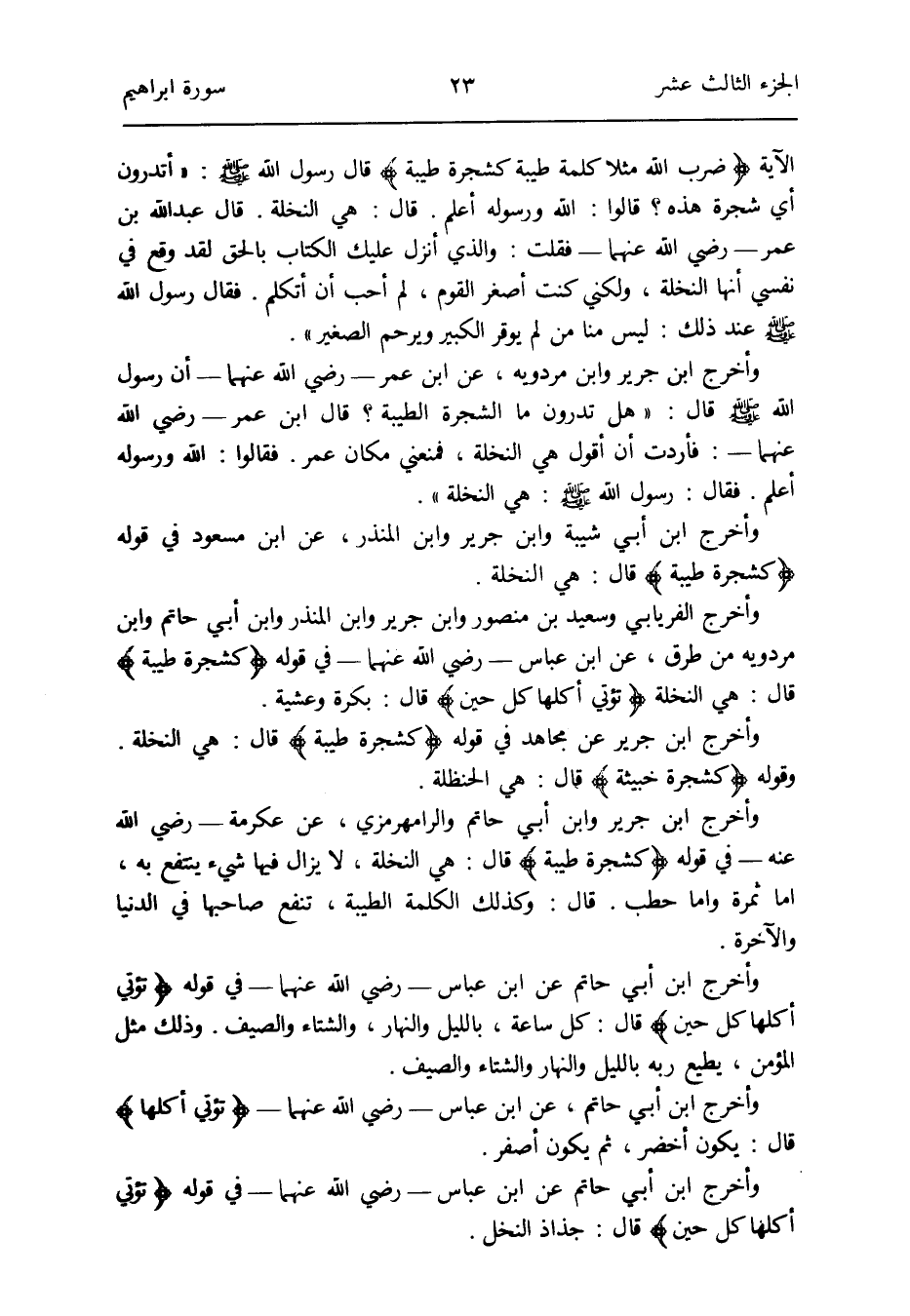 فَقَالَ: رَسُول الله صلى الله عَلَيْهِ وَسلم: هِيَ النَّخْلَة وَأخرج ابْن أبي شيبَة وَابْن جرير وَابْن الْمُنْذر عَن ابْن مَسْعُود فِي قَوْله: {كشجرة طيبَة} قَالَ: هِيَ النَّخْلَة وَأخرج الْفرْيَابِيّ وَسَعِيد بن مَنْصُور وَابْن جرير وَابْن الْمُنْذر وَابْن أبي حَاتِم وَابْن مرْدَوَيْه من طرق عَن ابْن عَبَّاس - رَضِي الله عَنْهُمَا - فِي قَوْله: {كشجرة طيبَة} قَالَ: هِيَ النَّخْلَة {تؤتي أكلهَا كل حِين} قَالَ بكرَة وَعَشِيَّة