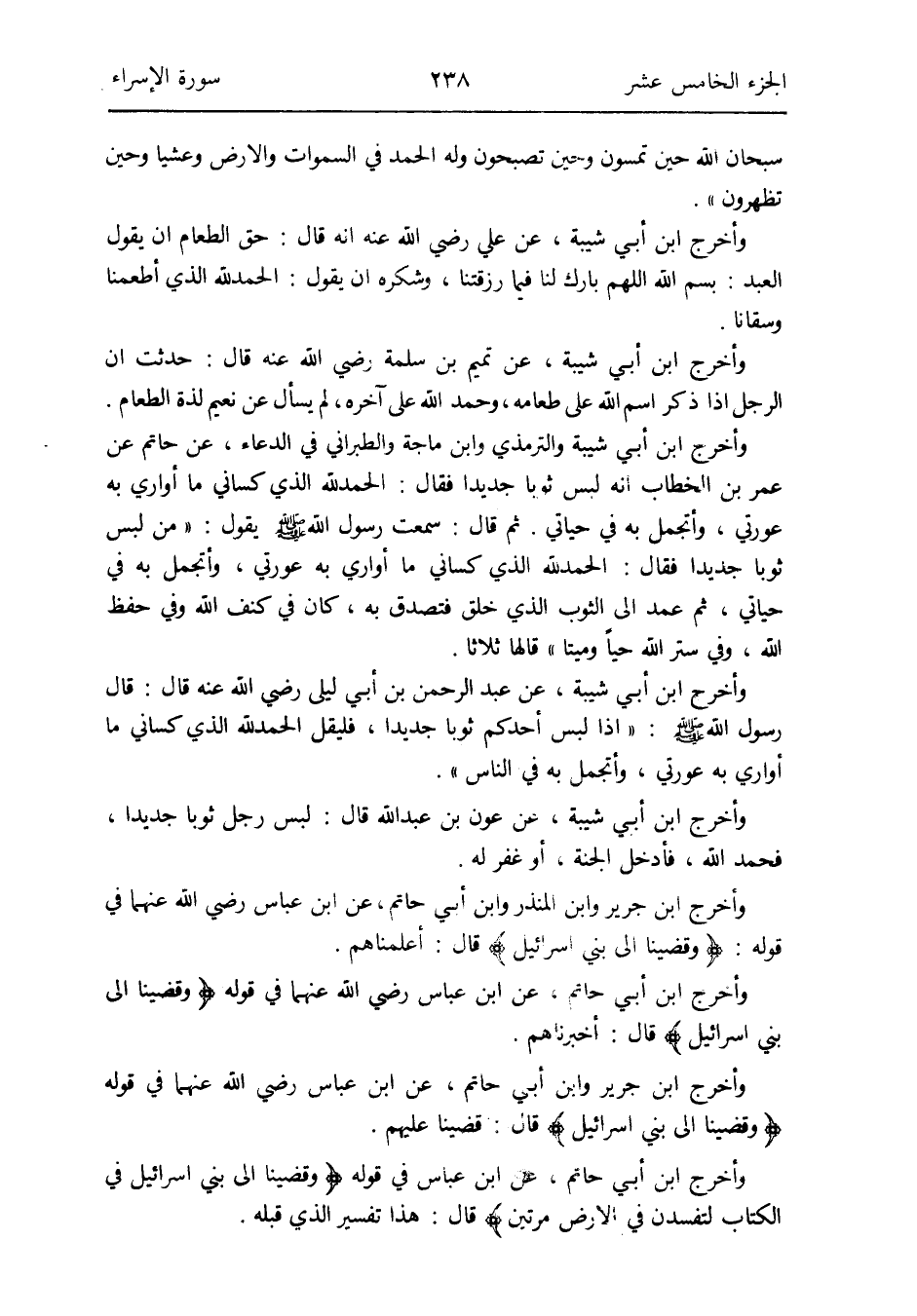 وَأخرج ابْن أبي حَاتِم عَن ابْن عَبَّاس رَضِي الله عَنْهُمَا فِي قَوْله: {وقضينا إِلَى بني إِسْرَائِيل فِي الْكتاب لتفسدن فِي الأَرْض مرَّتَيْنِ} قَالَ: هَذَا تَفْسِير الَّذِي قبله