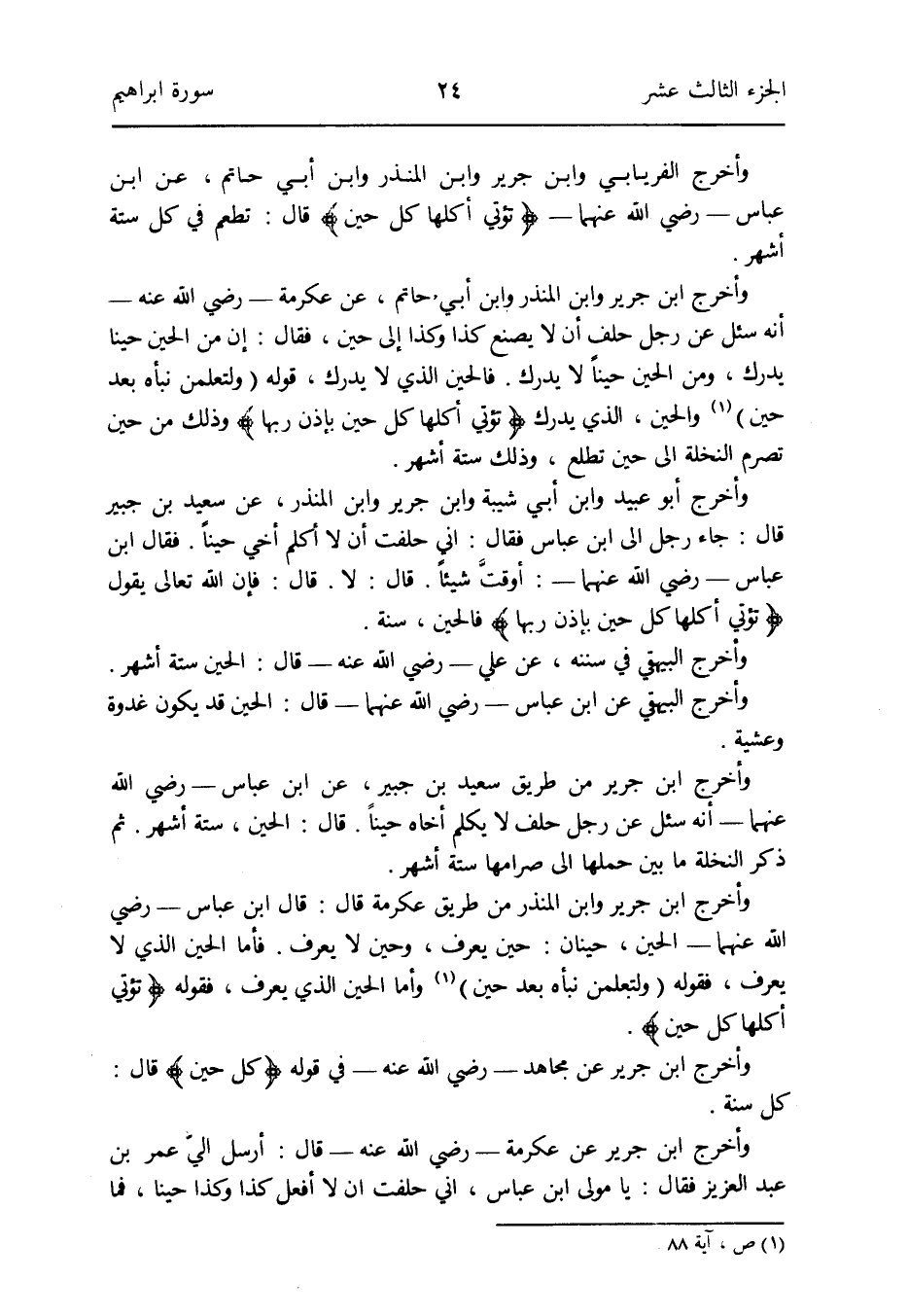 وَأخرج الْفرْيَابِيّ وَابْن جرير وَابْن الْمُنْذر وَابْن أبي حَاتِم عَن عِكْرِمَة - رَضِي الله عَنْهُمَا أَنه سُئِلَ عَن رجل حلف أَن لَا يصنع كَذَا وَكَذَا إِلَى حِين فَقَالَ: إِن من الْحِين حينا يدْرك وَمن الْحِين حينا لَا يدْرك