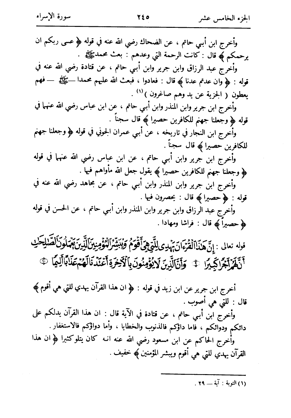 وَأخرج عبد الرَّزَّاق وَابْن جرير وَابْن أبي حَاتِم عَن قَتَادَة رَضِي الله عَنهُ فِي قَوْله: {وَإِن عدتم عدنا} قَالَ: فعادوا فَبعث الله عَلَيْهِم مُحَمَّدًا صلى الله عَلَيْهِ وَسلم فهم يُعْطون (الْجِزْيَة عَن يَد وهم صاغرون) (التَّوْبَة آيَة - 29)