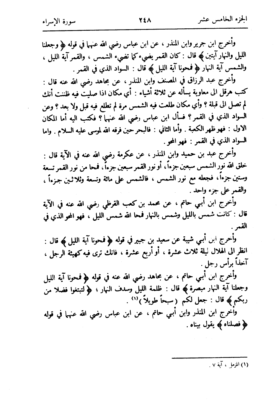 وَأخرج ابْن أبي حَاتِم عَن مُجَاهِد رَضِي الله عَنهُ فِي قَوْله: {فمحونا آيَة اللَّيْل وَجَعَلنَا آيَة النَّهَار مبصرة} قَالَ: ظلمَة اللَّيْل وسدف النَّهَار {لتبتغوا فضلا من ربكُم} قَالَ: جعل لكم (سبحا طَويلا) (المزمل آيَة 7)