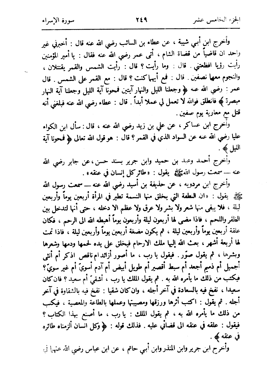وَأخرج أَحْمد وَعبد بن حميد وَابْن جرير بِسَنَد حسن عَن جَابر رَضِي الله عَنهُ سَمِعت رَسُول الله صلى الله عَلَيْهِ وَسلم يَقُول: طَائِر كل إِنْسَان فِي عُنُقه