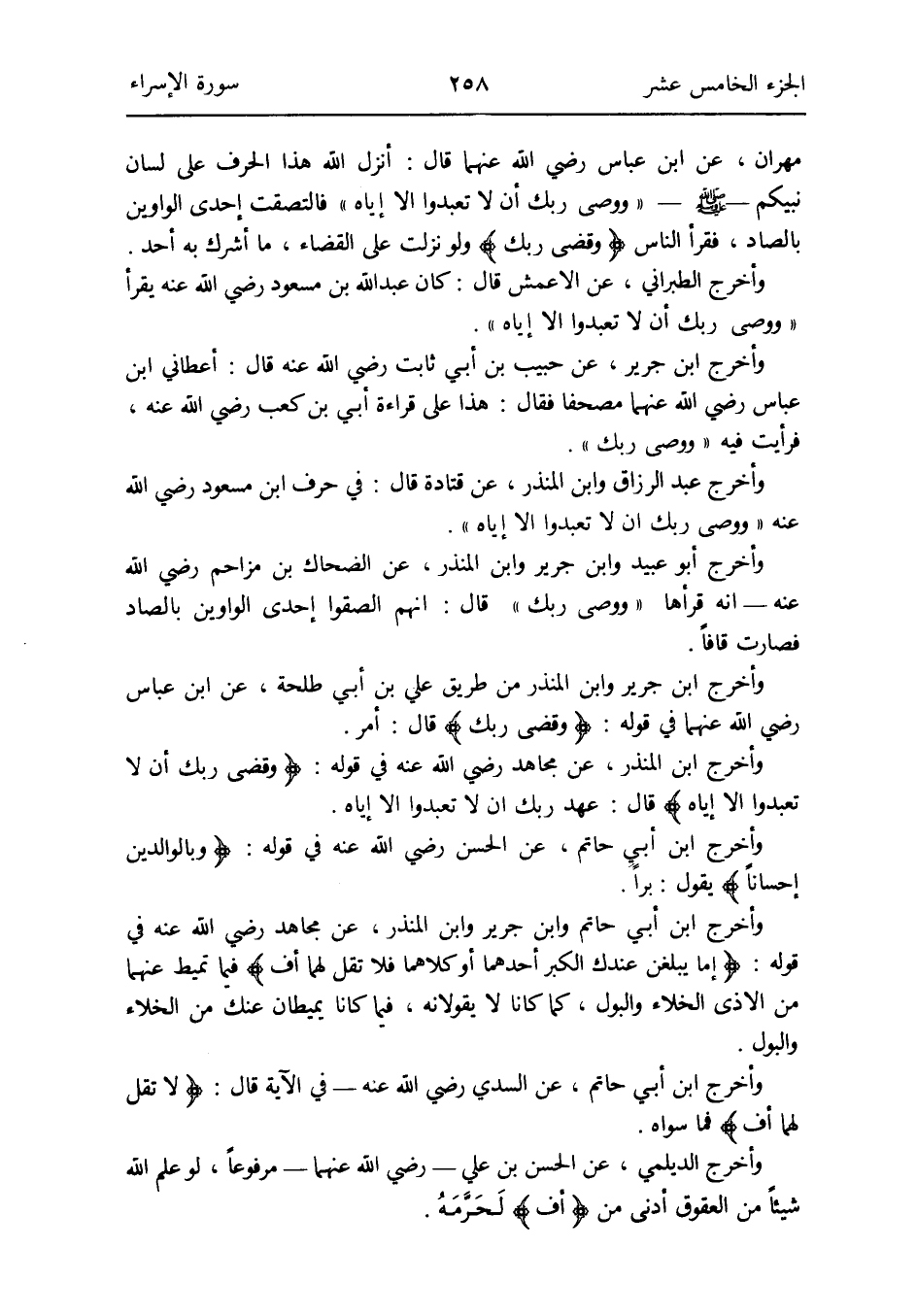 وَأخرج عبد الرَّزَّاق وَابْن الْمُنْذر عَن قَتَادَة قَالَ: فِي حرف ابْن مَسْعُود رَضِي الله عَنهُ ووصى رَبك أَن لَا تعبدوا إِلَّا إِيَّاه