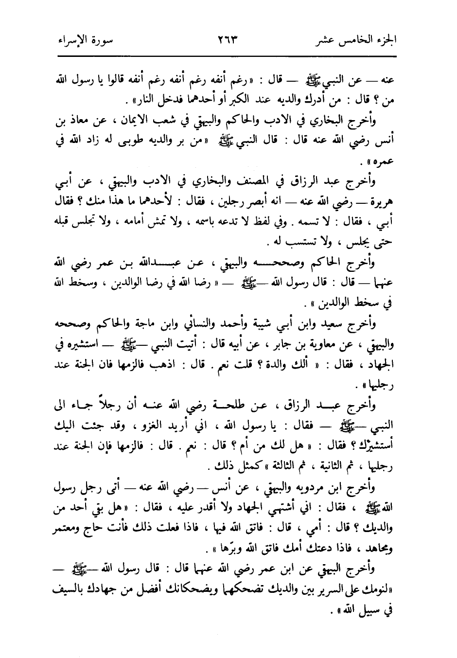 وَأخرج الْبَيْهَقِيّ عَن ابْن عمر رَضِي الله عَنْهُمَا قَالَ: قَالَ رَسُول الله صلى الله عَلَيْهِ وَسلم لنومك على السرير بَين والديك تضحكهما ويضحكانك أفضل من جهادك بِالسَّيْفِ فِي سَبِيل الله
