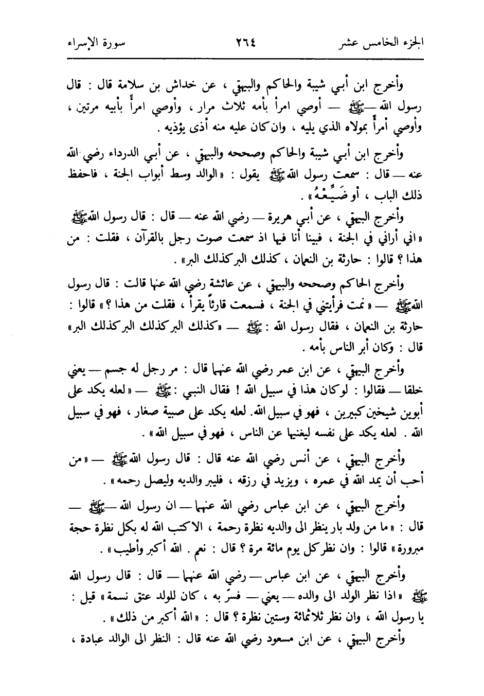 وَأخرج الْحَاكِم وَصَححهُ وَالْبَيْهَقِيّ عَن عَائِشَة رَضِي الله عَنْهَا قَالَت: قَالَ رَسُول الله صلى الله عَلَيْهِ وَسلم نمت فرأيتني فِي الْجنَّة فَسمِعت قَارِئًا يقْرَأ فَقلت من هَذَا قَالُوا: حَارِثَة بن النُّعْمَان فَقَالَ رَسُول الله صلى الله عَلَيْهِ وَسلم: كَذَلِك الْبر كَذَلِك الْبر كَذَلِك الْبر قَالَ: وَكَانَ أبر النَّاس بِأُمِّهِ