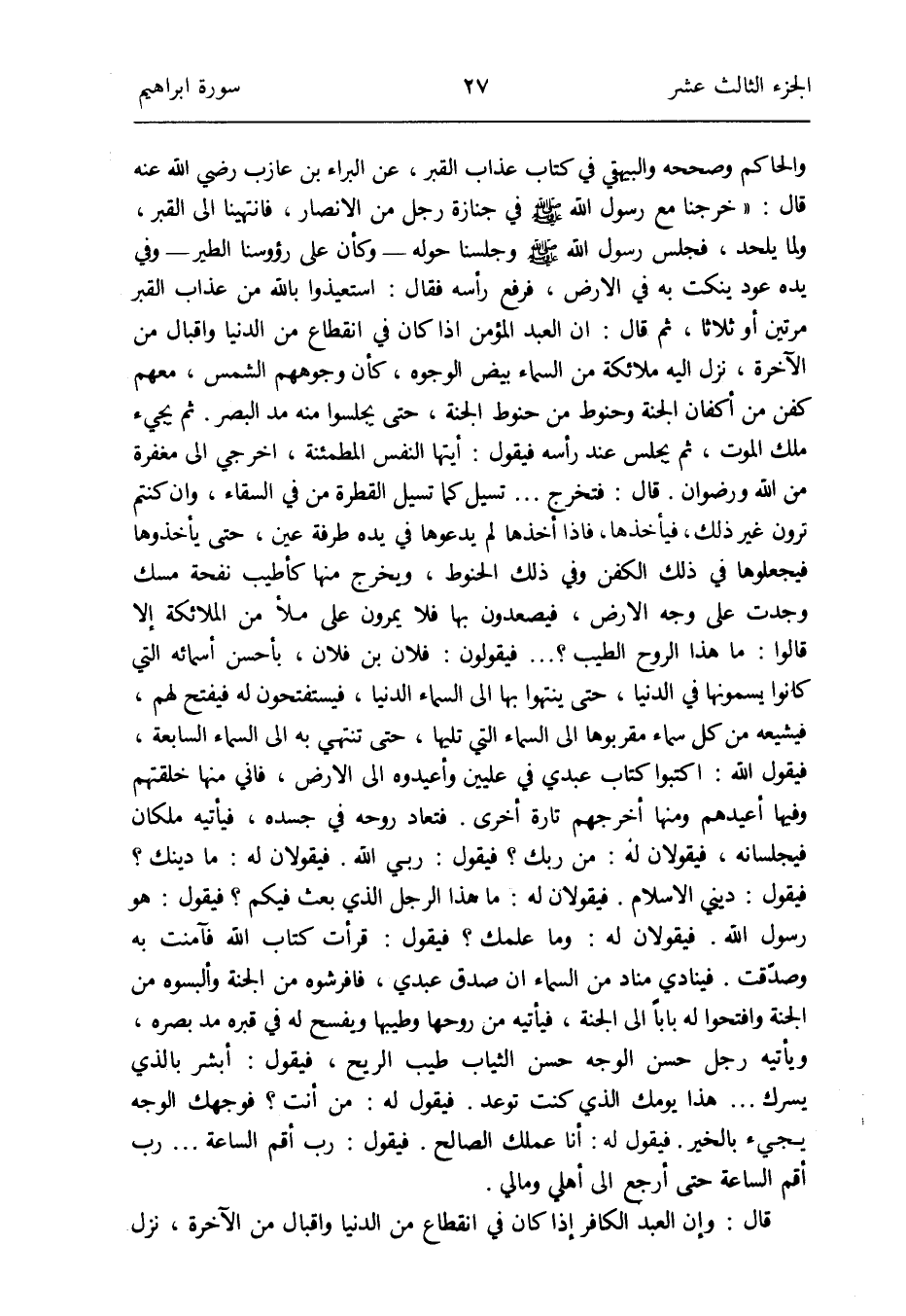 وَالْحَاكِم فِي صَححهُ وَالْبَيْهَقِيّ فِي كتاب عَذَاب الْقَبْر عَن الْبَراء بن عَازِب رَضِي الله عَنهُ قَالَ: خرجنَا مَعَ رَسُول الله صلى الله عَلَيْهِ وَسلم فِي جَنَازَة رجل من الْأَنْصَار فَانْتَهَيْنَا إِلَى الْقَبْر وَلما يلْحد فَجَلَسَ رَسُول الله صلى الله عَلَيْهِ وَسلم وَجَلَسْنَا حوله - وَكَأن على رؤوسنا الطير - وَفِي يَده عودا ينكت بِهِ الأَرْض فَرفع رَأسه فَقَالَ: استعيذوا بِاللَّه من عَذَاب الْقَبْر - مرَّتَيْنِ أَو ثَلَاثًا