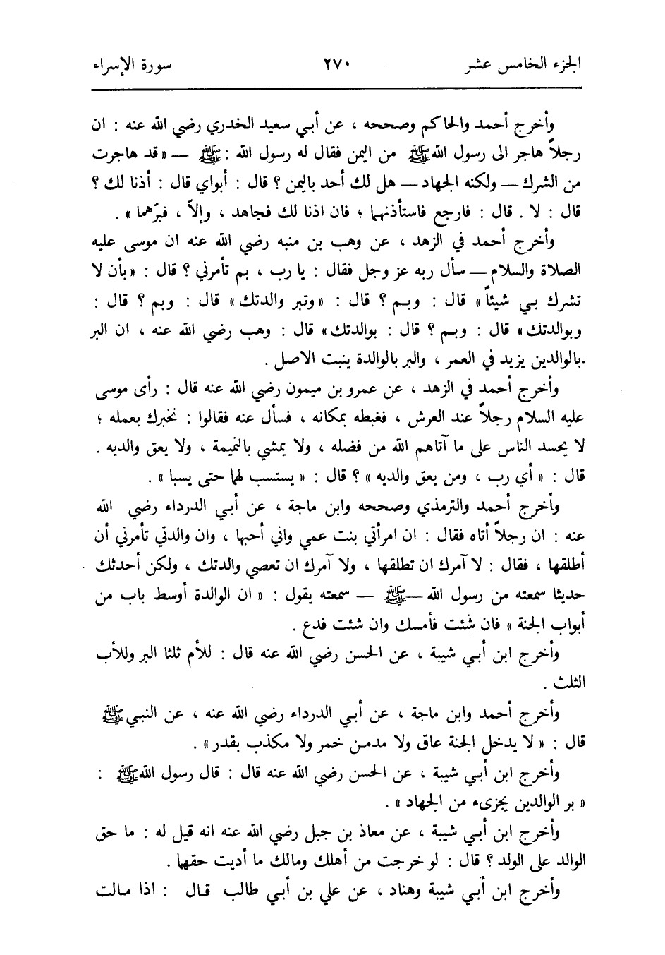 وَأخرج ابْن أبي شيبَة عَن معَاذ بن جبل رَضِي الله عَنهُ أَنه قيل لَهُ: مَا حق الْوَالِد على الْوَلَد قَالَ: لَو خرجت من أهلك وَمَالك مَا أدّيت حَقّهمَا