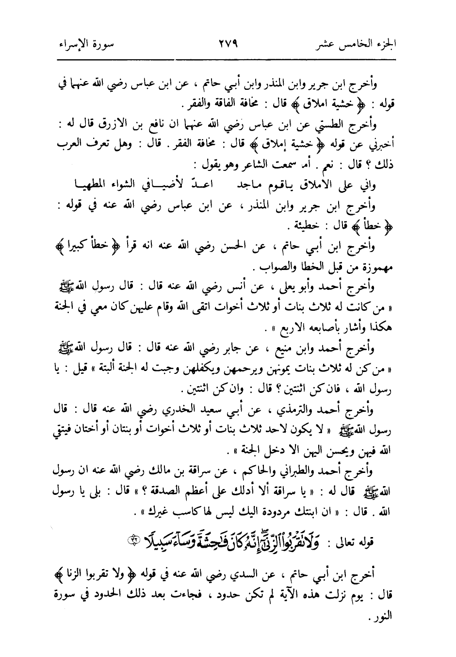 وَأخرج ابْن جرير وَابْن الْمُنْذر وَابْن أبي حَاتِم عَن ابْن عَبَّاس رَضِي الله عَنْهُمَا فِي قَوْله: {خشيَة إملاق} قَالَ: مَخَافَة الْفَاقَة والفقر