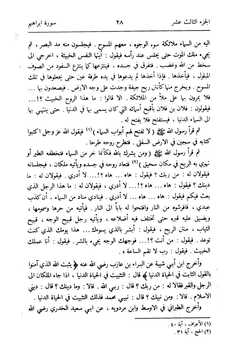 وَأخرج ابْن أبي شيبَة عَن الْبَراء بن عَازِب رَضِي الله عَنهُ {يثبت الله الَّذين آمنُوا بالْقَوْل الثَّابِت فِي الْحَيَاة الدُّنْيَا} قَالَ: التثبيت فِي الْحَيَاة الدُّنْيَا إِذا جَاءَ الْملكَانِ إِلَى الرجل والقبر فَقَالَا لَهُ: من رَبك قَالَ: رَبِّي الله