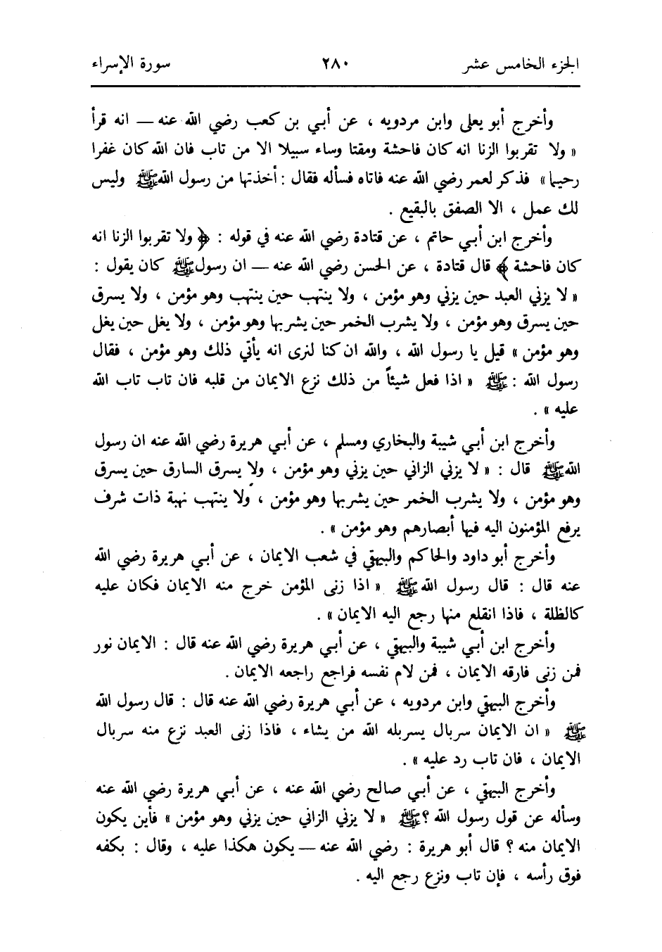 وَأخرج ابْن أبي شيبَة وَالْبُخَارِيّ وَمُسلم عَن أبي هُرَيْرَة رَضِي الله عَنهُ أَن رَسُول الله صلى الله عَلَيْهِ وَسلم قَالَ: لَا يَزْنِي الزَّانِي حِين يَزْنِي وَهُوَ مُؤمن وَلَا يسرق السَّارِق حِين يسرق وَهُوَ مُؤمن وَلَا يشرب الْخمر حِين يشْربهَا وَهُوَ مُؤمن وَلَا ينتهب نهبة ذَات شرف يرفع الْمُؤْمِنُونَ إِلَيْهِ فِيهَا أَبْصَارهم وَهُوَ مُؤمن