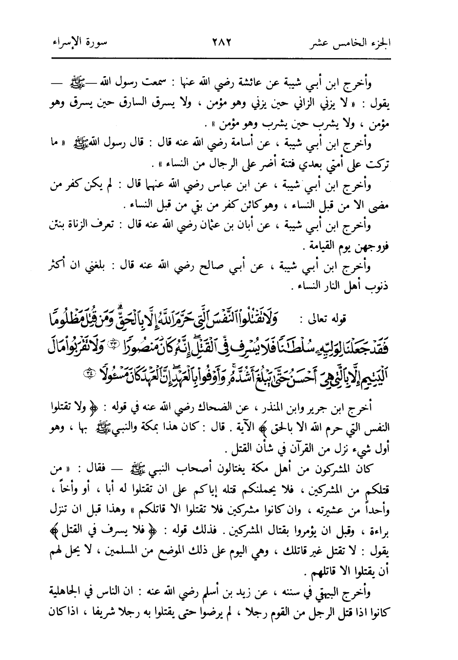 أخرج ابْن جرير وَابْن الْمُنْذر عَن الضَّحَّاك رَضِي الله عَنهُ فِي قَوْله: {وَلَا تقتلُوا النَّفس الَّتِي حرم الله إِلَّا بِالْحَقِّ} الْآيَة