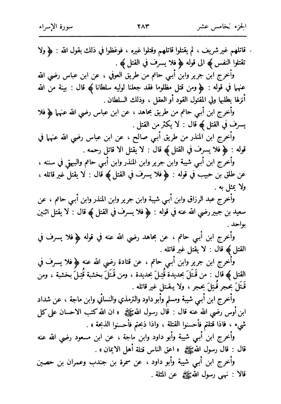 وَأخرج عبد الرَّزَّاق وَابْن أبي شيبَة وَابْن جرير وَابْن الْمُنْذر وَابْن أبي حَاتِم عَن سعيد بن جُبَير رَضِي الله عَنهُ فِي قَوْله: {فَلَا يسرف فِي الْقَتْل} قَالَ: لَا يقتل اثْنَيْنِ بِوَاحِد