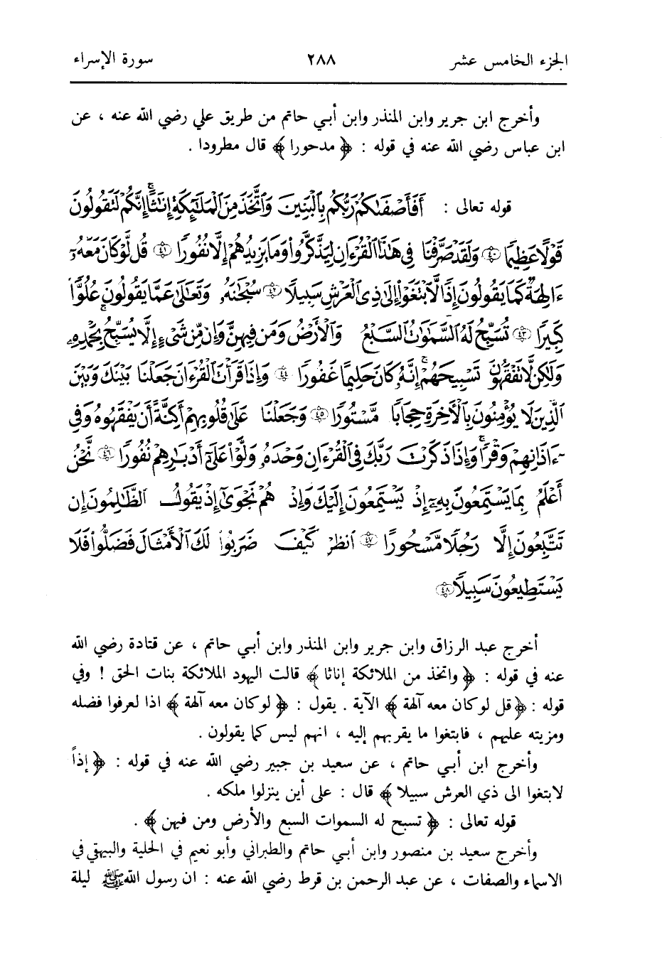 أخرج عبد الرَّزَّاق وَابْن جرير وَابْن الْمُنْذر وَابْن أبي حَاتِم عَن قَتَادَة رَضِي الله عَنهُ فِي قَوْله: {وَاتخذ من الْمَلَائِكَة إِنَاثًا} قَالَت الْيَهُود: الْمَلَائِكَة بَنَات الْحق وَفِي قَوْله: {قل لَو كَانَ مَعَه آلِهَة} الْآيَة
