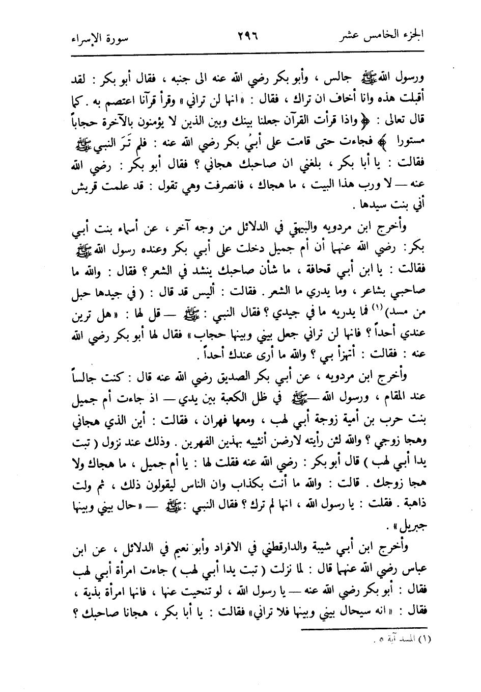 وَأخرج ابْن مرْدَوَيْه عَن أبي بكر الصّديق رَضِي الله عَنهُ قَالَ: كنت جَالِسا عِنْد الْمقَام وَرَسُول الله صلى الله عَلَيْهِ وَسلم فِي ظلّ الْكَعْبَة بَين يَدي إِذْ جَاءَت أم جميل بنت حَرْب بن أُميَّة زَوْجَة أبي لَهب وَمَعَهَا فهران فَقَالَت: أَيْن الَّذِي هجاني وهجا زَوجي وَالله لَئِن رَأَيْته لارضن أنثييه بِهَذَيْنِ الفهرين