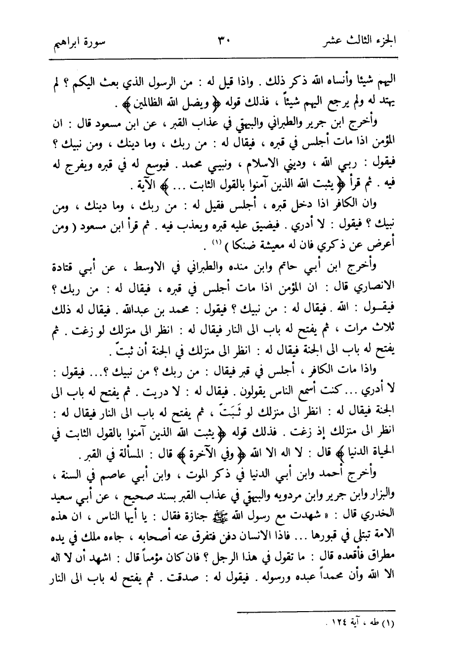 وَأخرج ابْن جرير وَالطَّبَرَانِيّ وَالْبَيْهَقِيّ فِي عَذَاب الْقَبْر عَن ابْن مَسْعُود قَالَ: إِن الْمُؤمن إِذا مَاتَ أَجْلِس فِي قَبره فَيُقَال لَهُ: من رَبك وَمَا دينك وَمن نبيك فَيَقُول: رَبِّي الله وديني الإِسلام ونبيي مُحَمَّد