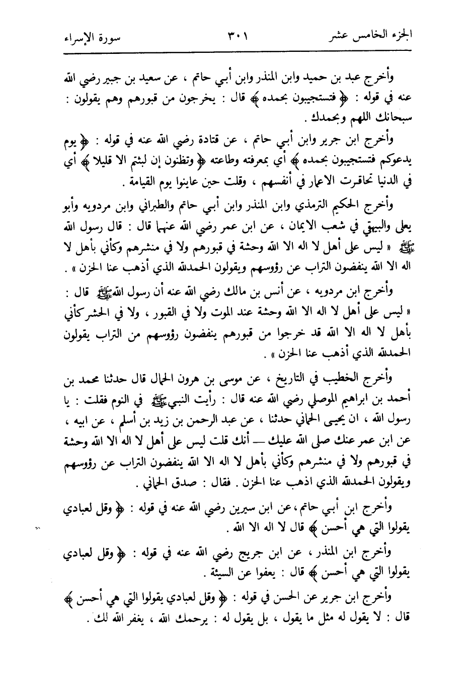 وَأخرج ابْن أبي حَاتِم عَن ابْن سِيرِين رَضِي الله عَنهُ فِي قَوْله: {وَقل لعبادي يَقُولُوا الَّتِي هِيَ أحسن} قَالَ: لَا إِلَه إِلَّا الله