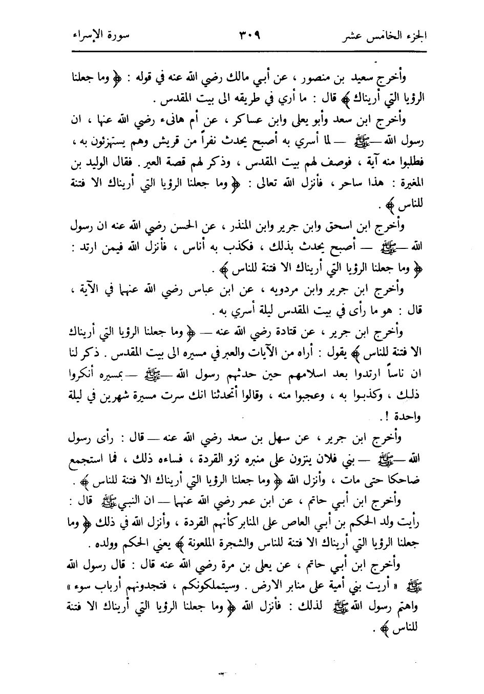 وَأخرج سعيد بن مَنْصُور عَن أبي مَالك رَضِي الله عَنهُ فِي قَوْله: {وَمَا جعلنَا الرُّؤْيَا الَّتِي أريناك} قَالَ: مَا أرِي فِي طَرِيقه إِلَى بَيت الْمُقَدّس