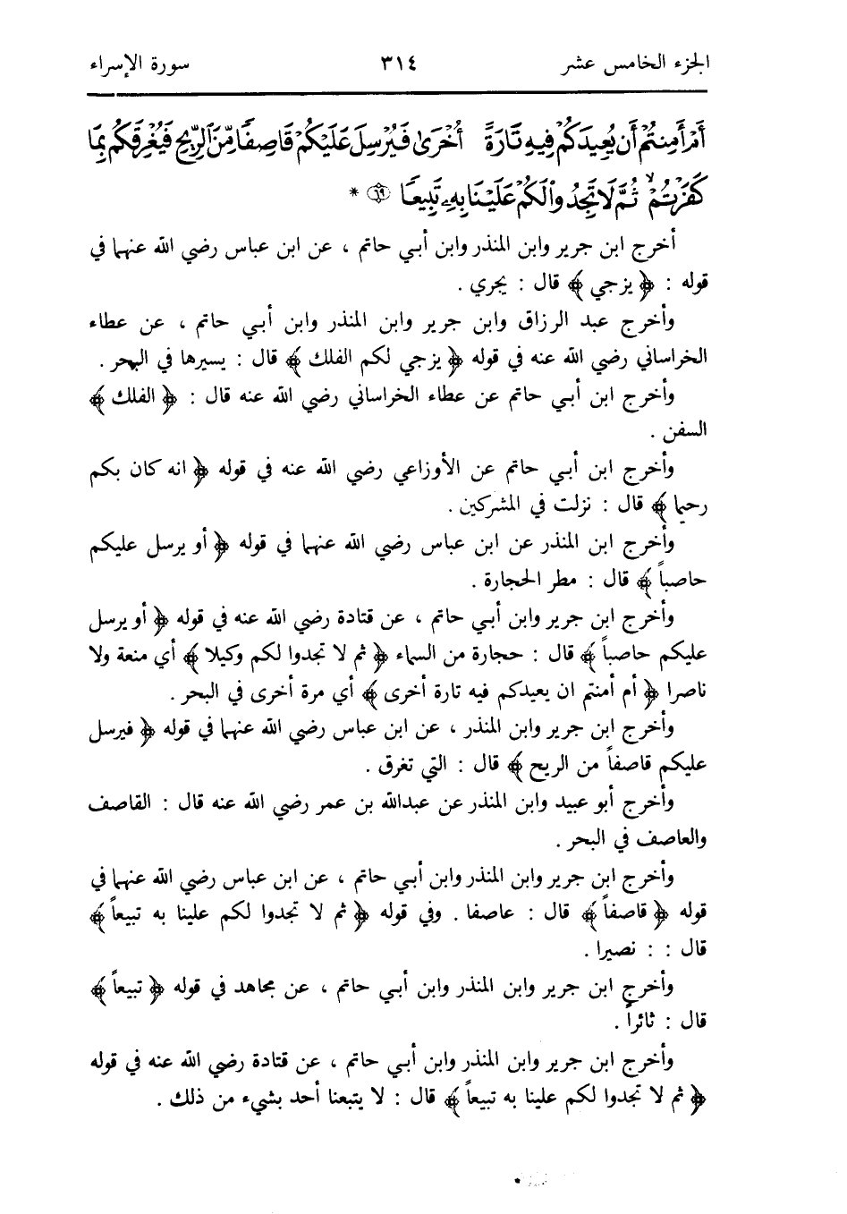 وَأخرج ابْن جرير وَابْن الْمُنْذر عَن ابْن عَبَّاس رَضِي الله عَنْهُمَا فِي قَوْله: {فَيُرْسل عَلَيْكُم قاصفاً من الرّيح} قَالَ: الَّتِي تغرق