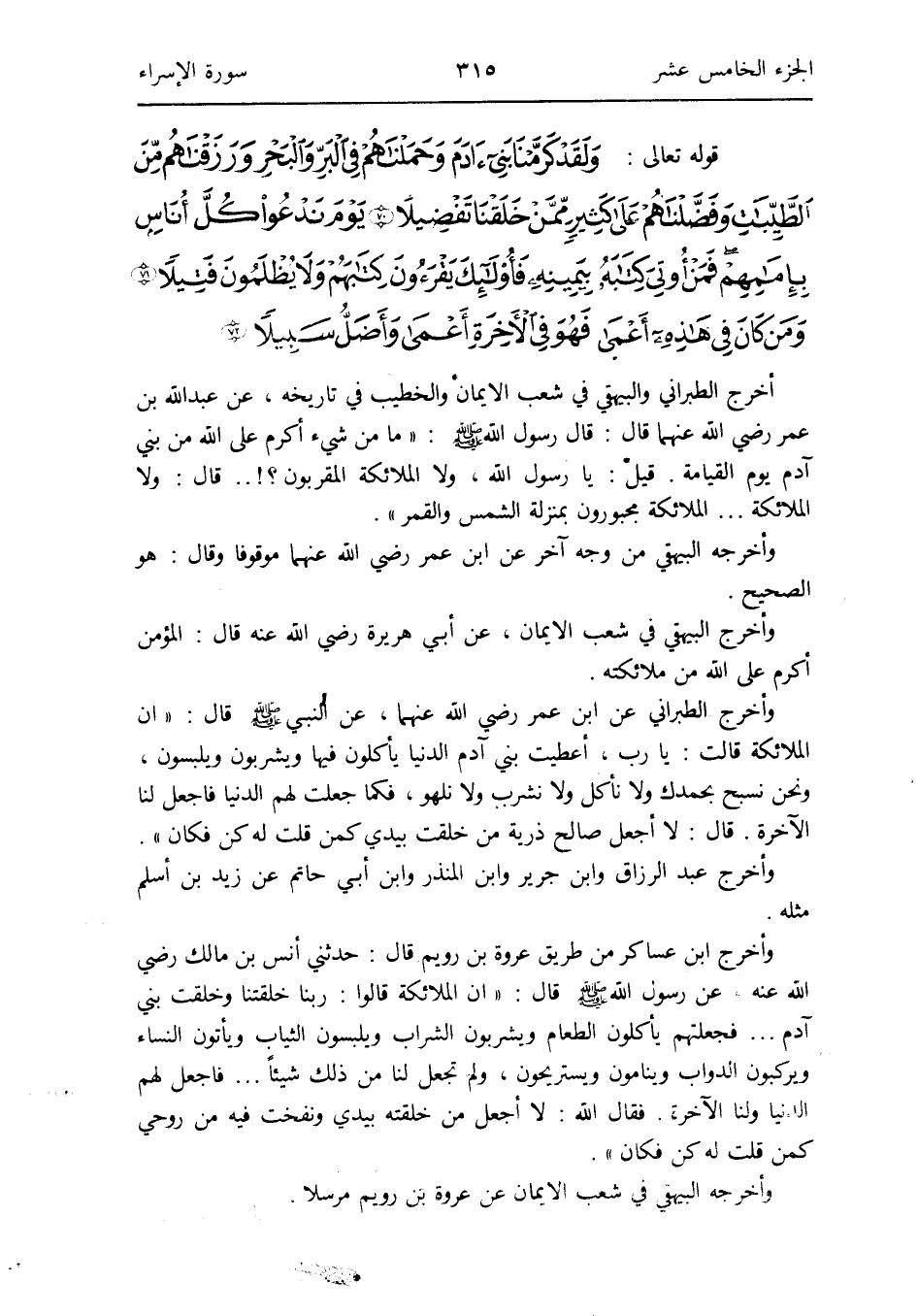 أخرج الطَّبَرَانِيّ وَالْبَيْهَقِيّ فِي شعب الإِيمان والخطيب فِي تَارِيخه عَن عبد الله بن عمر رَضِي الله عَنْهُمَا قَالَ: قَالَ رَسُول الله صلى الله عَلَيْهِ وَسلم: مَا من شَيْء أكْرم على الله من بني آدم يَوْم الْقِيَامَة