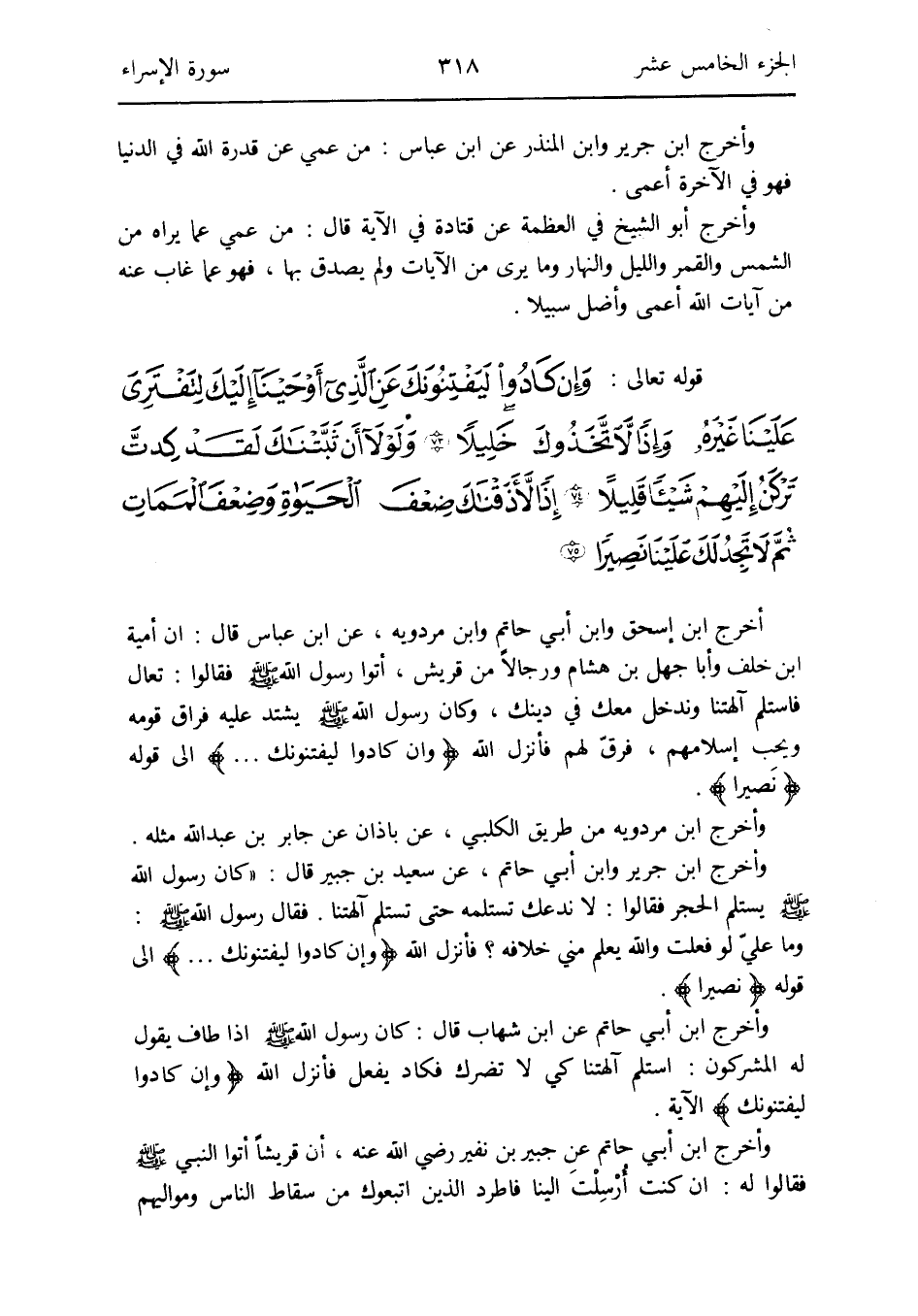 أخرج ابْن إِسْحَق وَابْن أبي حَاتِم وَابْن مرْدَوَيْه عَن ابْن عَبَّاس قَالَ: إِن أُميَّة بن خلف وَأَبا جهل بن هِشَام ورجالاً من قُرَيْش أَتَوا رَسُول الله صلى الله عَلَيْهِ وَسلم فَقَالُوا: تعال فاستلم آلِهَتنَا وندخل مَعَك فِي دينك وَكَانَ رَسُول الله صلى الله عَلَيْهِ وَسلم يشْتَد عَلَيْهِ فِرَاق قومه وَيُحب إسْلَامهمْ فرقّ لَهُم فَأنْزل الله {وَإِن كَادُوا لَيَفْتِنُونَك} إِلَى قَوْله {نَصِيرًا}