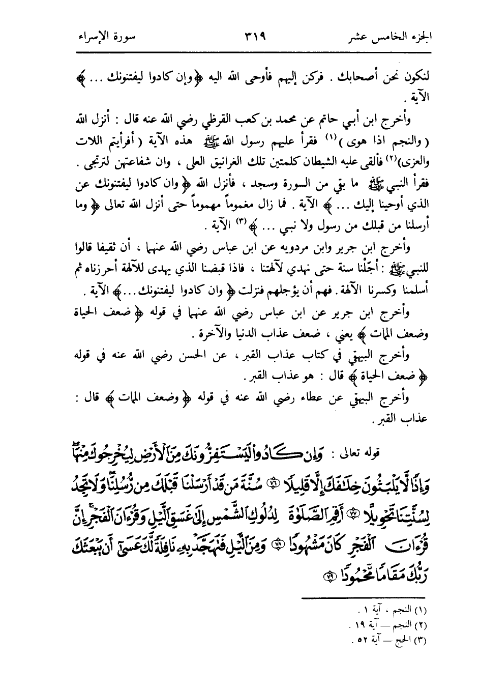 وَأخرج ابْن أبي حَاتِم عَن مُحَمَّد بن كَعْب الْقرظِيّ رَضِي الله عَنهُ قَالَ: أنزل الله (والنجم إِذا هوى) (النَّجْم آيَة 1) فَقَرَأَ عَلَيْهِم رَسُول الله صلى الله عَلَيْهِ وَسلم هَذِه الْآيَة (أَفَرَأَيْتُم اللات والعزى) (النَّجْم آيَة 19) فَألْقى عَلَيْهِ الشَّيْطَان كَلِمَتَيْنِ تِلْكَ الغرانيق العلى وَإِن شفاعتهن لترتجى