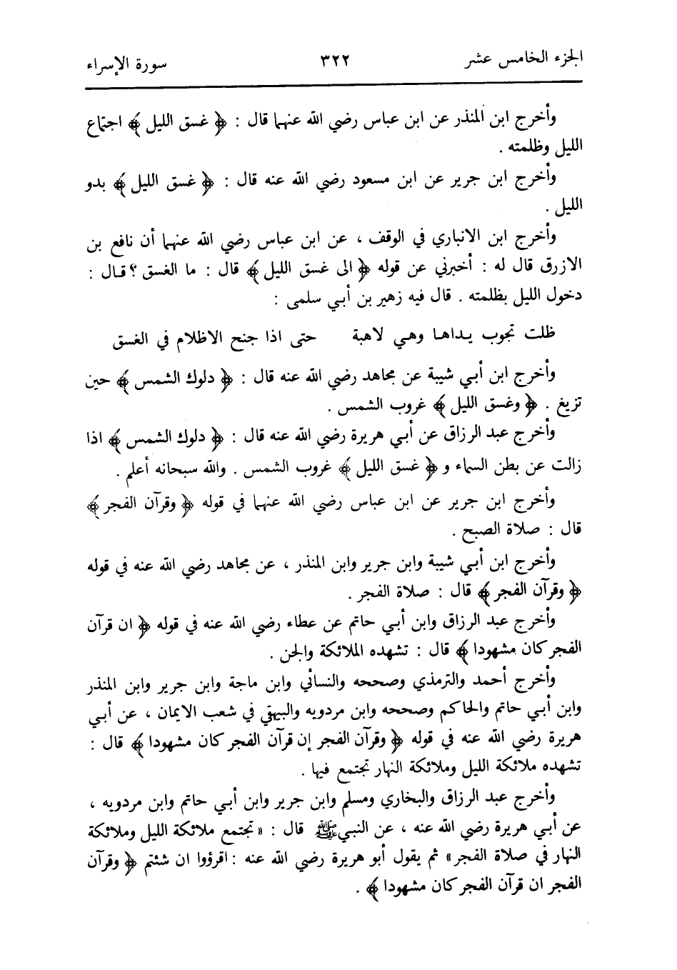 وَأخرج أَحْمد وَالتِّرْمِذِيّ وَصَححهُ وَالنَّسَائِيّ وَابْن ماجة وَابْن جرير وَابْن الْمُنْذر وَابْن أبي حَاتِم وَالْحَاكِم وَصَححهُ وَابْن مرْدَوَيْه وَالْبَيْهَقِيّ فِي شعب الإِيمان عَن أبي هُرَيْرَة رَضِي الله عَنهُ فِي قَوْله: {وَقُرْآن الْفجْر إِن قُرْآن الْفجْر كَانَ مشهوداً} قَالَ: تشهده مَلَائِكَة اللَّيْل وملائكة النَّهَار تَجْتَمِع فِيهَا